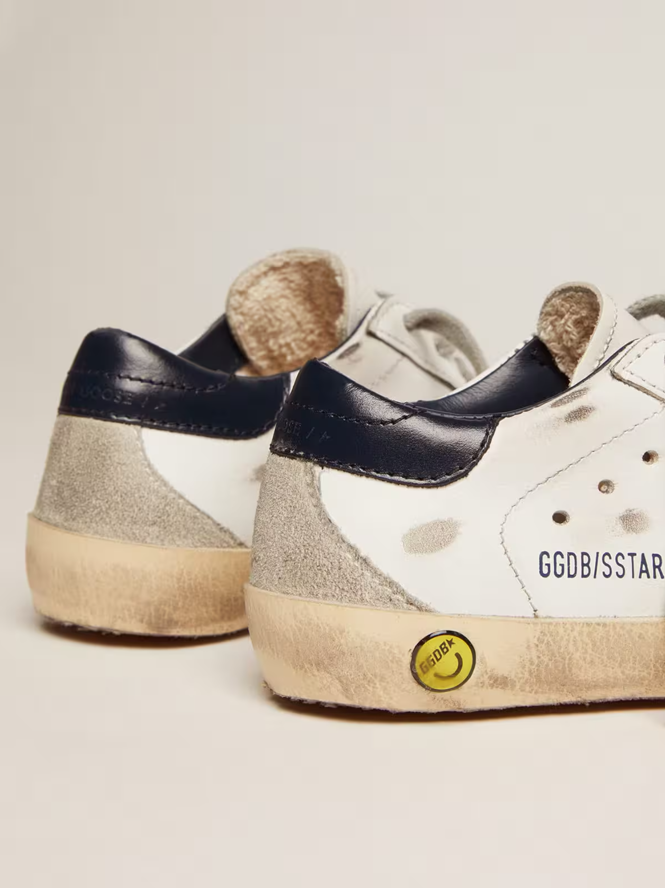 Ljósir strigaskór frá Golden Goose með Dökkbláum hælkappa.