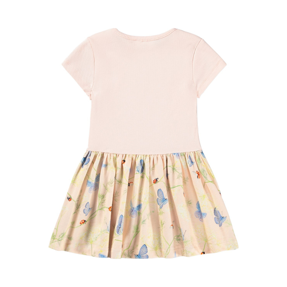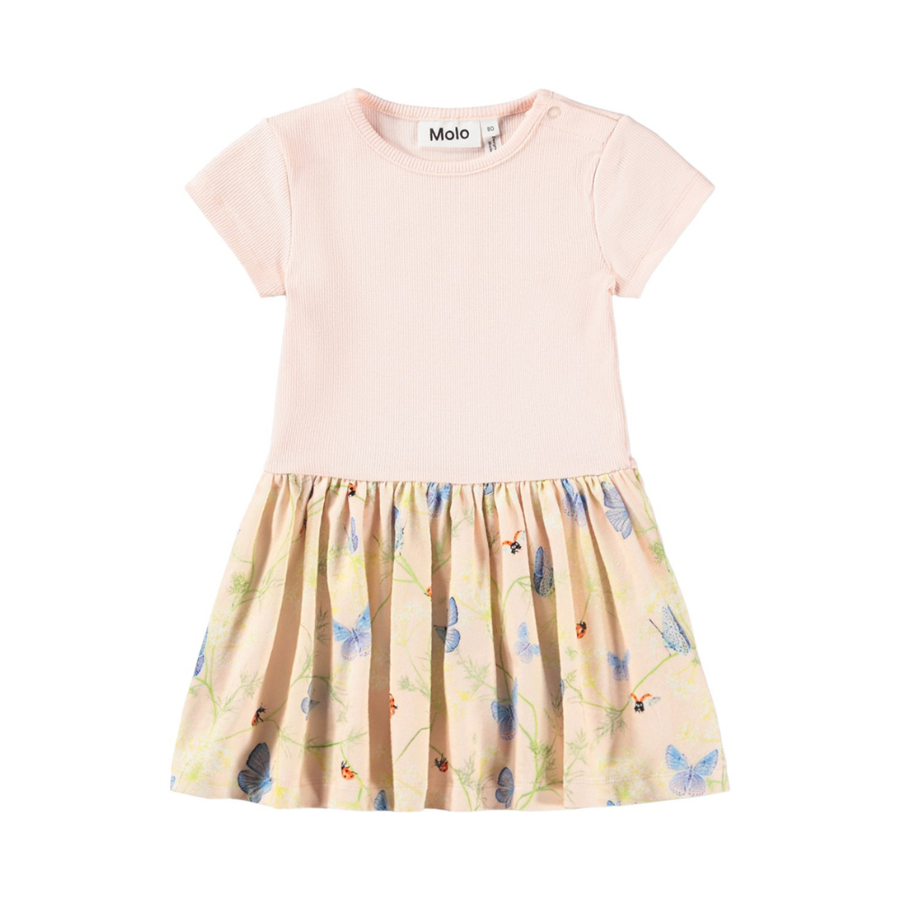 Fallegur Molo kjóll með ljós bláum, einlitum efri hluta og mynstruðu pilsi. 95% bómull og 5% elastane.