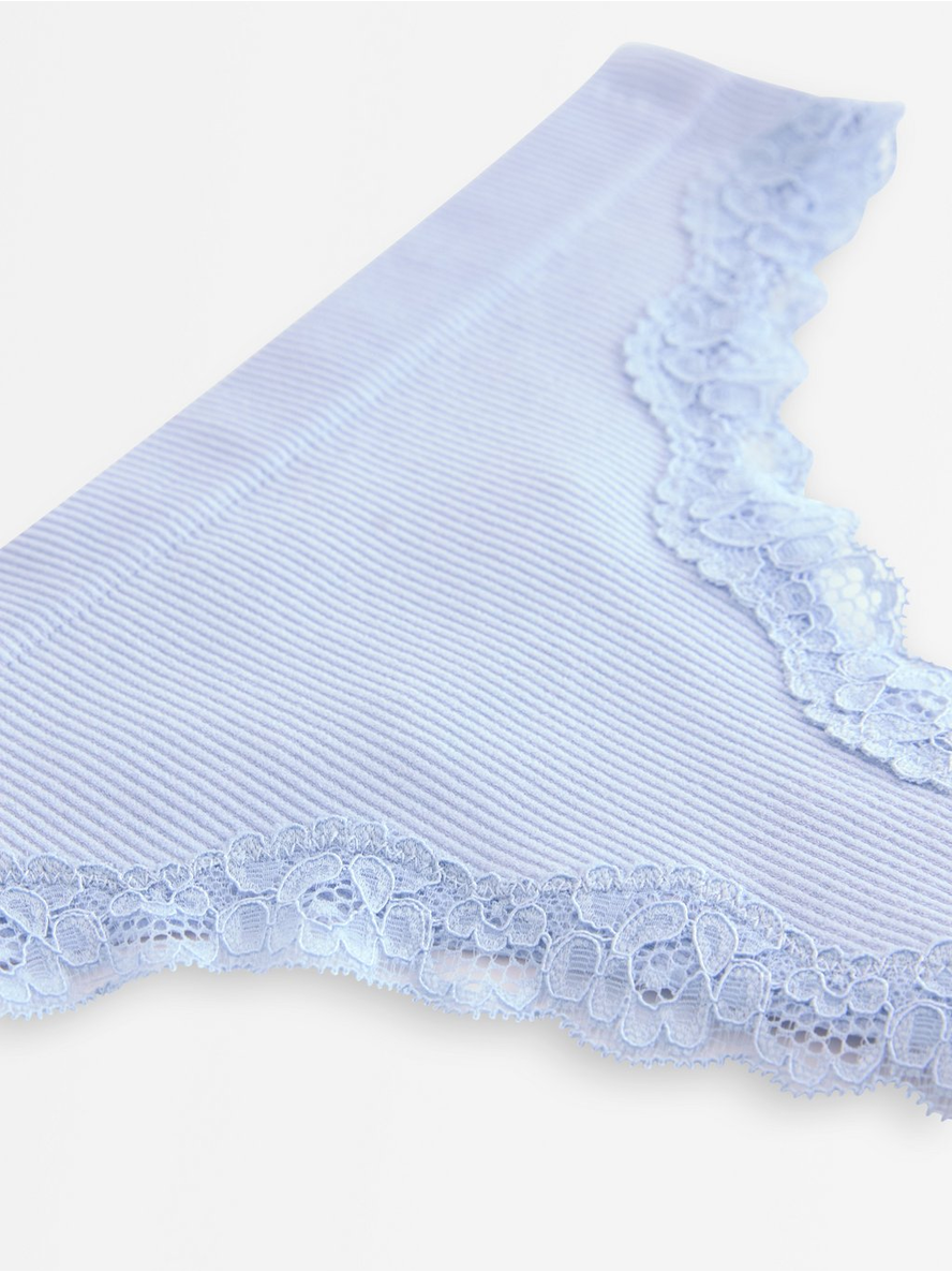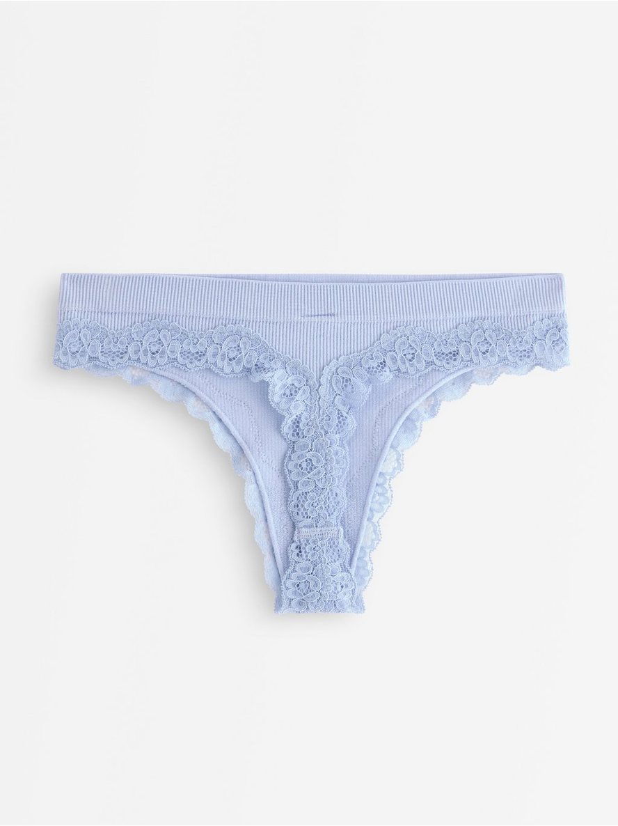 Ribbed thong with a low waist and lace details. Lined crotch Seamless design Low waist Contains 61% recycled polyamide 86% pólýamíð 13% elastan 1% bómull