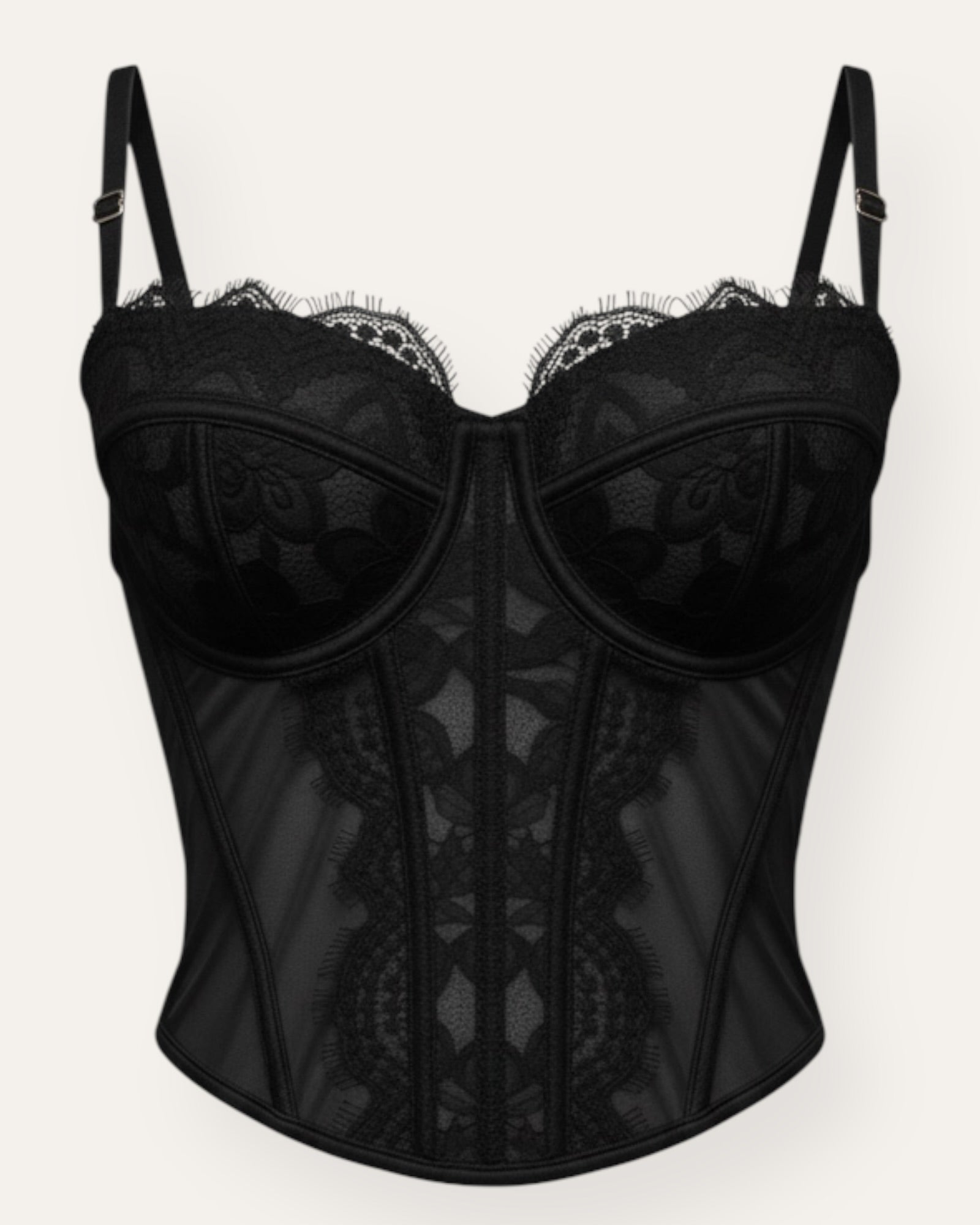 Fallegur og kvenlegur corset toppur úr mesh efni með fíngerðu blúndu detaili. Topurinn mótar líkamann fallega og gefur glæsilegt, feminine look. Stillanlegar axlabönd og fallegt snið gera hann ... Sjá nánar