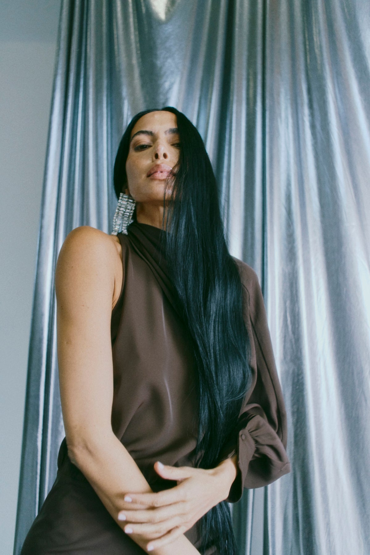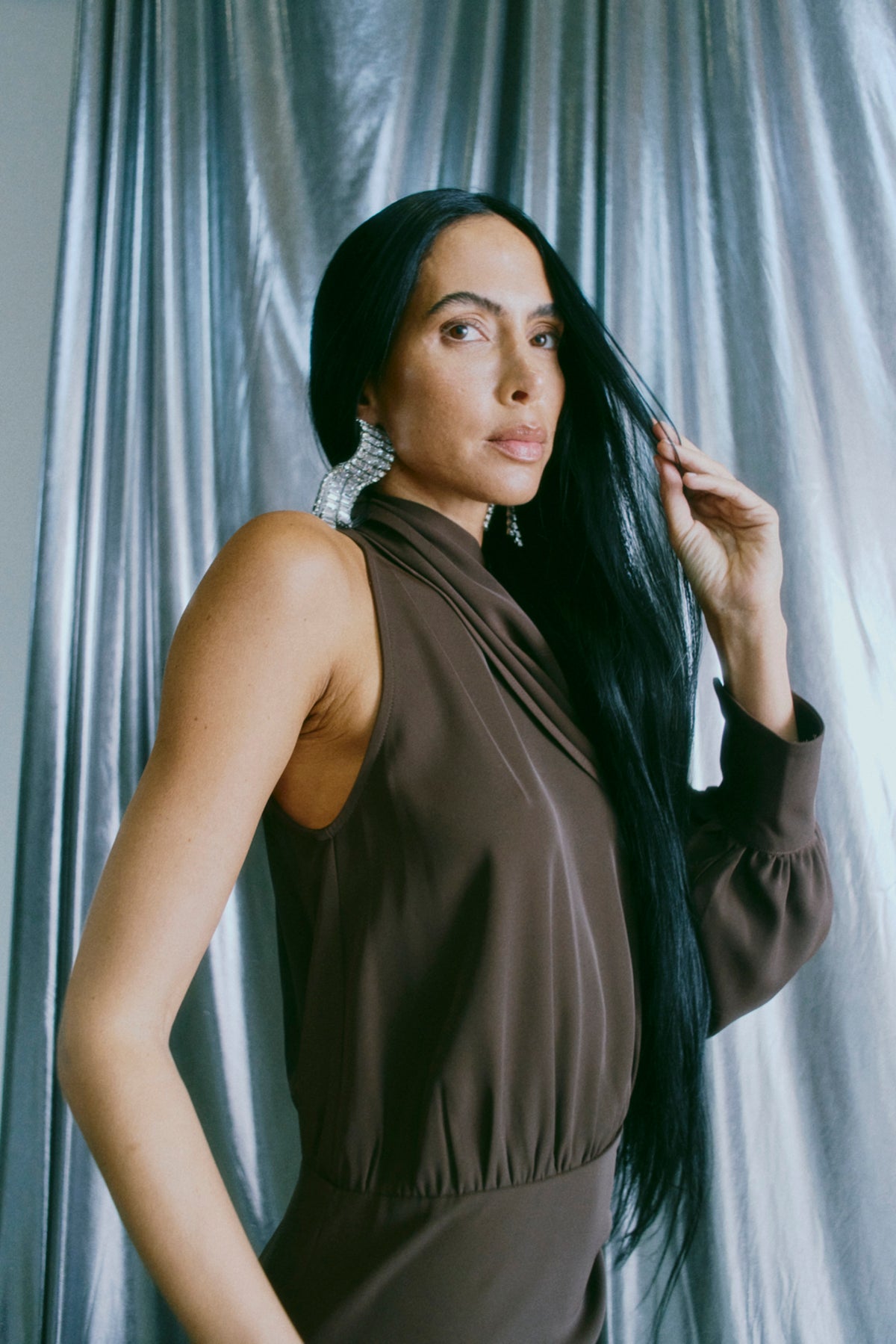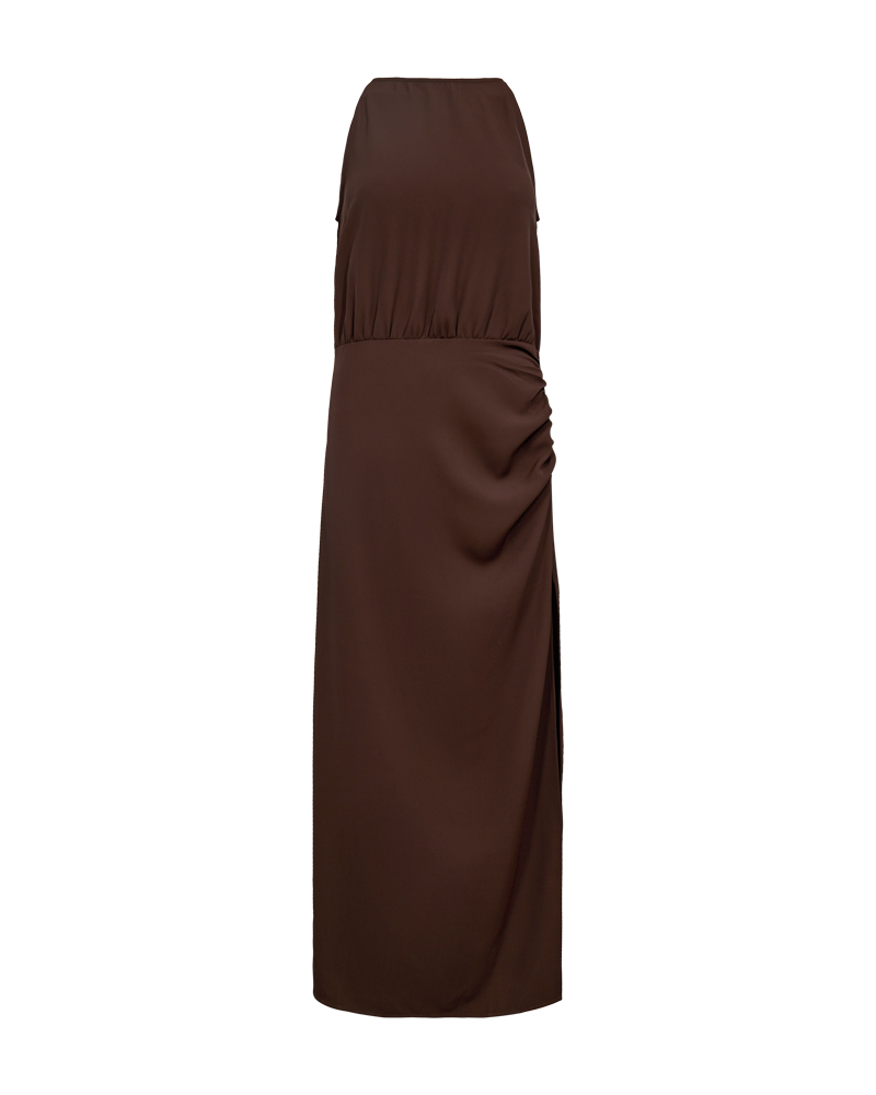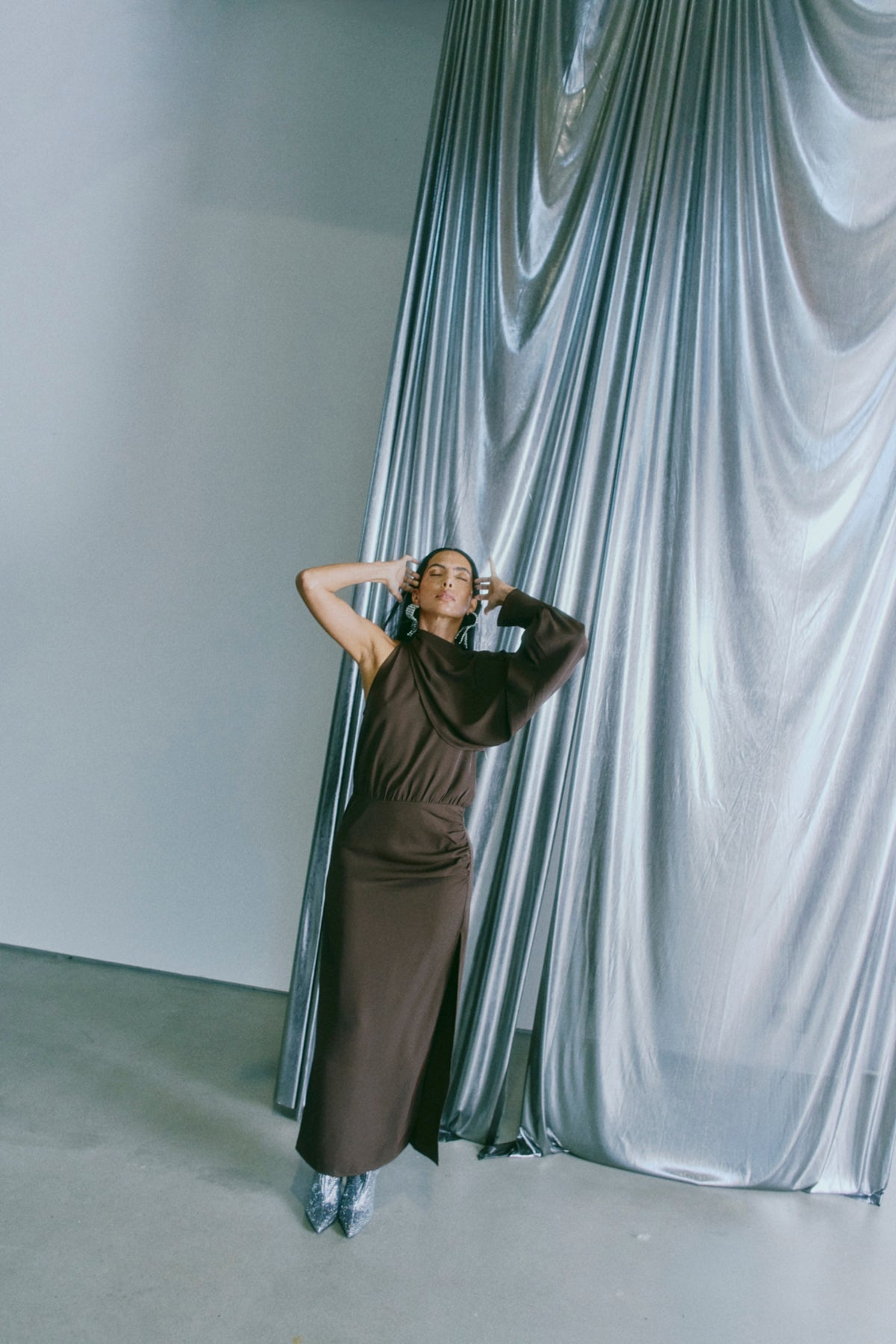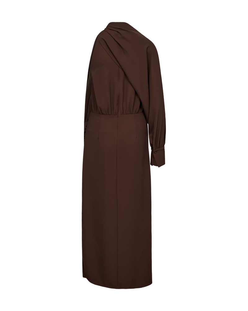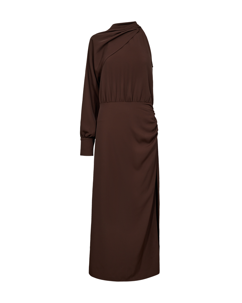 Geggjaður súkkulaði brúnn kjóll frá CopenhagenMuse. Hægt er að taka ermina af. 92%polyester 8%teygja