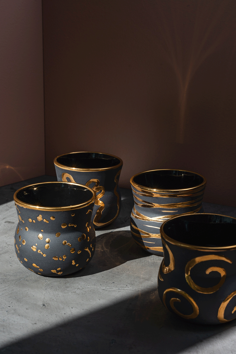 Handgerður Veltibolli úr svörtu postulíni, málaður með þykkri 24 karata gyllingu og þolir því ekki uppþvottavélar og örbylgjuofna. Bollinn hefur þann eiginleika að hitna ekki efst þegar hellt ... Sjá nánar