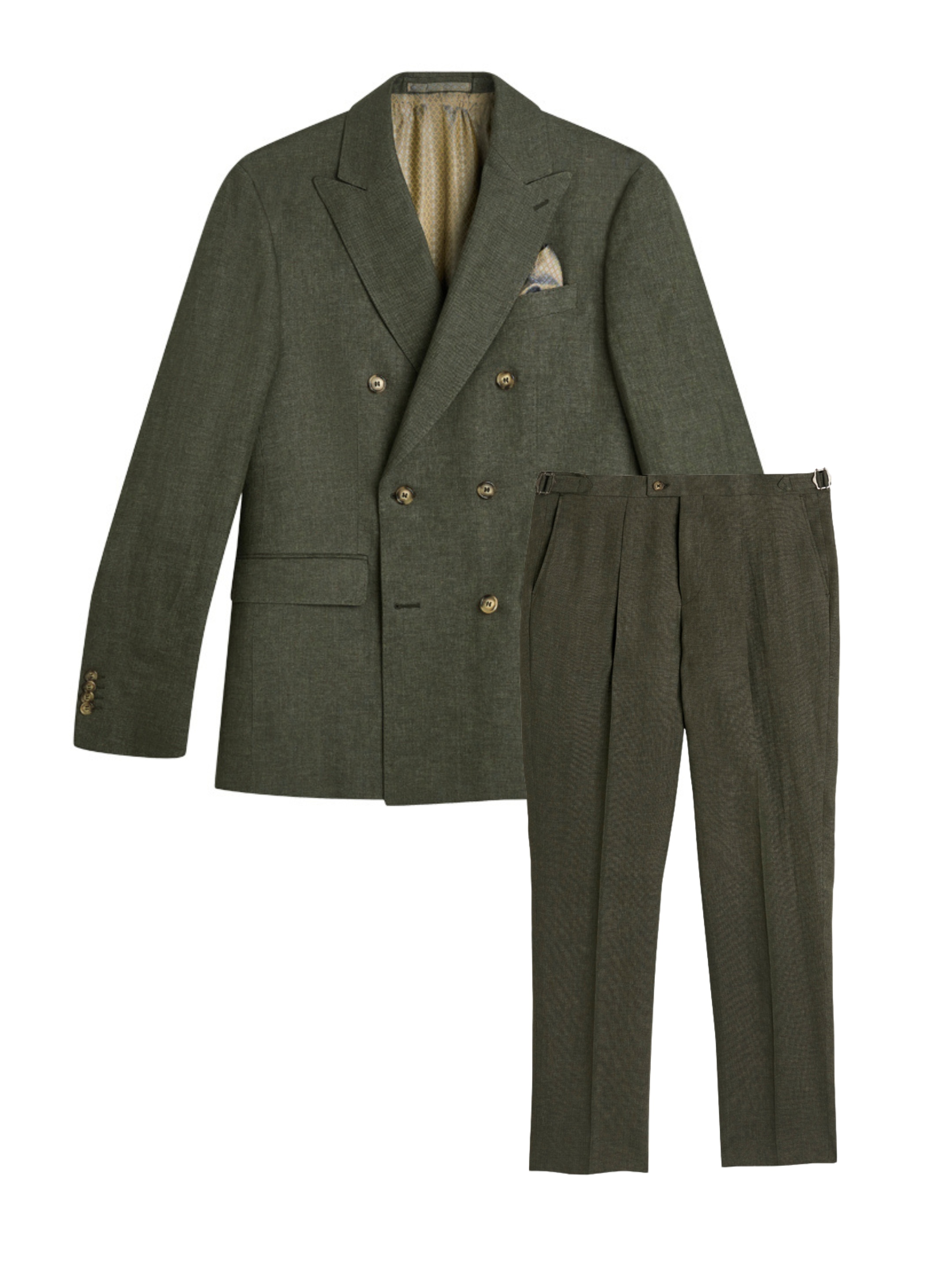 Blazer Peaked lapel Double breasted Light constructed shoulders AMF stitch - Chest / Flap pockets Two vents on back Fully lined Italian fabric Pure linen "Delave" effect Trousers Straight leg ... Sjá nánar
