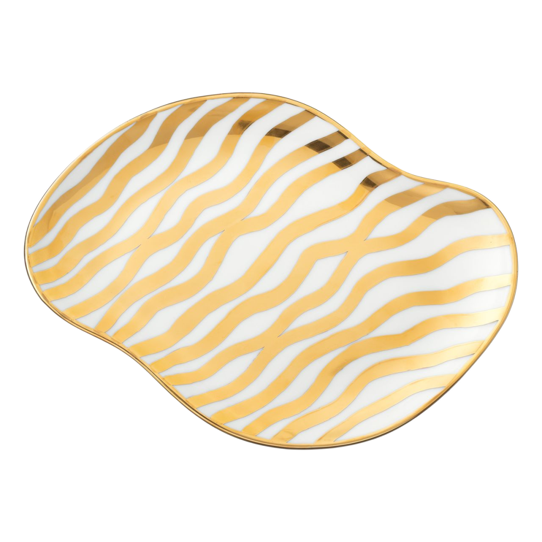 Skýjadiskurinn með mynstrinu Bylgja er mótaður úr hágæða postulíni og handmálaður mikilli nákvæmni með þykkri 24 karata gyllingu. Yfirborð disksins er glerjað fyrir slétta, jafna og glansandi ... Sjá nánar