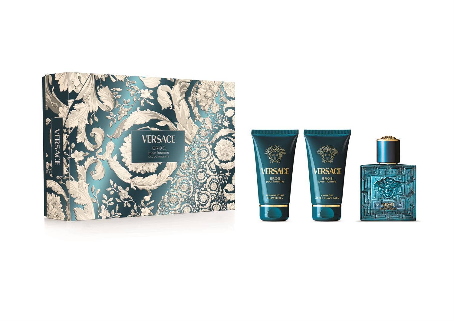 Eros Eau de Toilette 50ml ásamt sturtugeli 50ml og krem eftir rakstur 50ml.