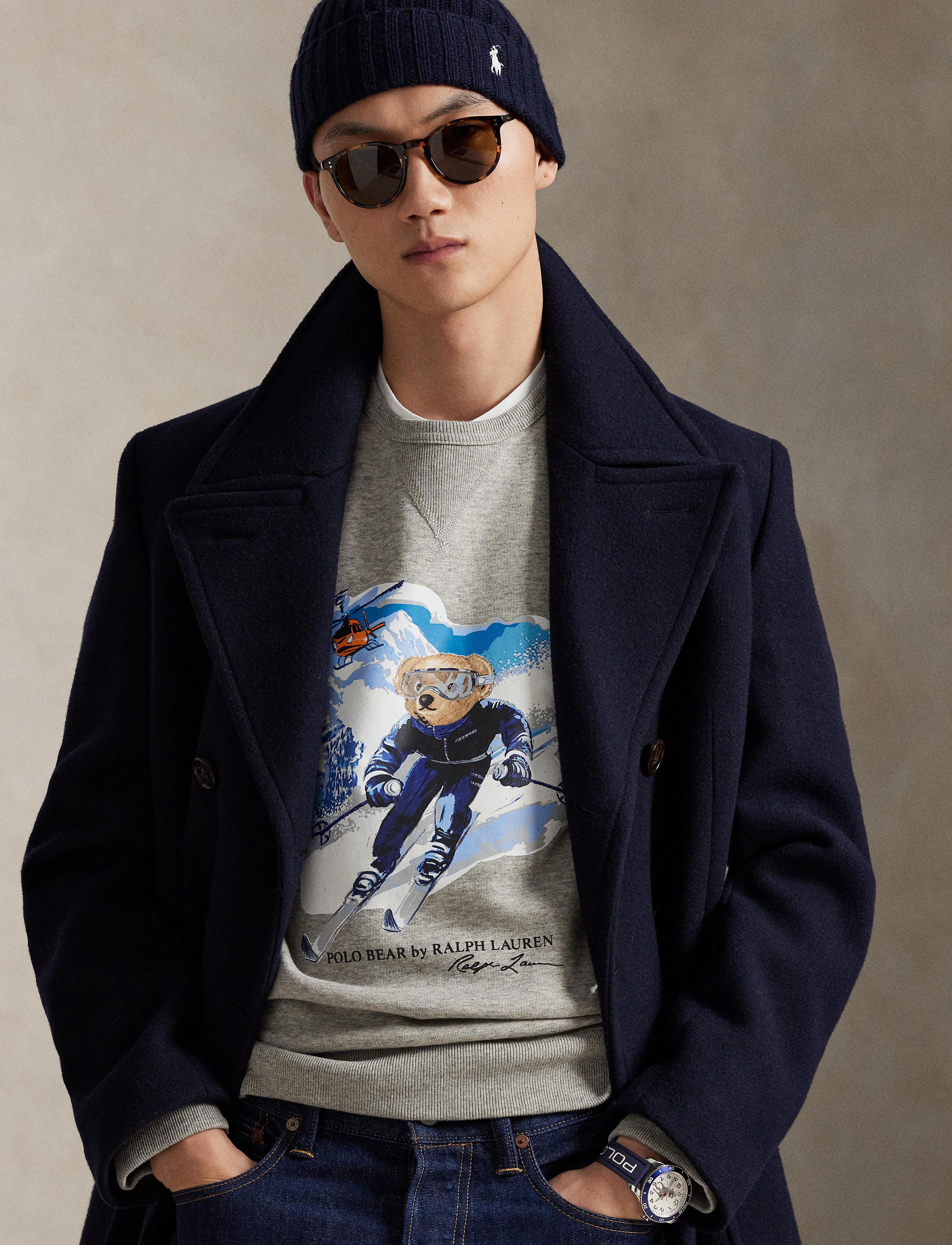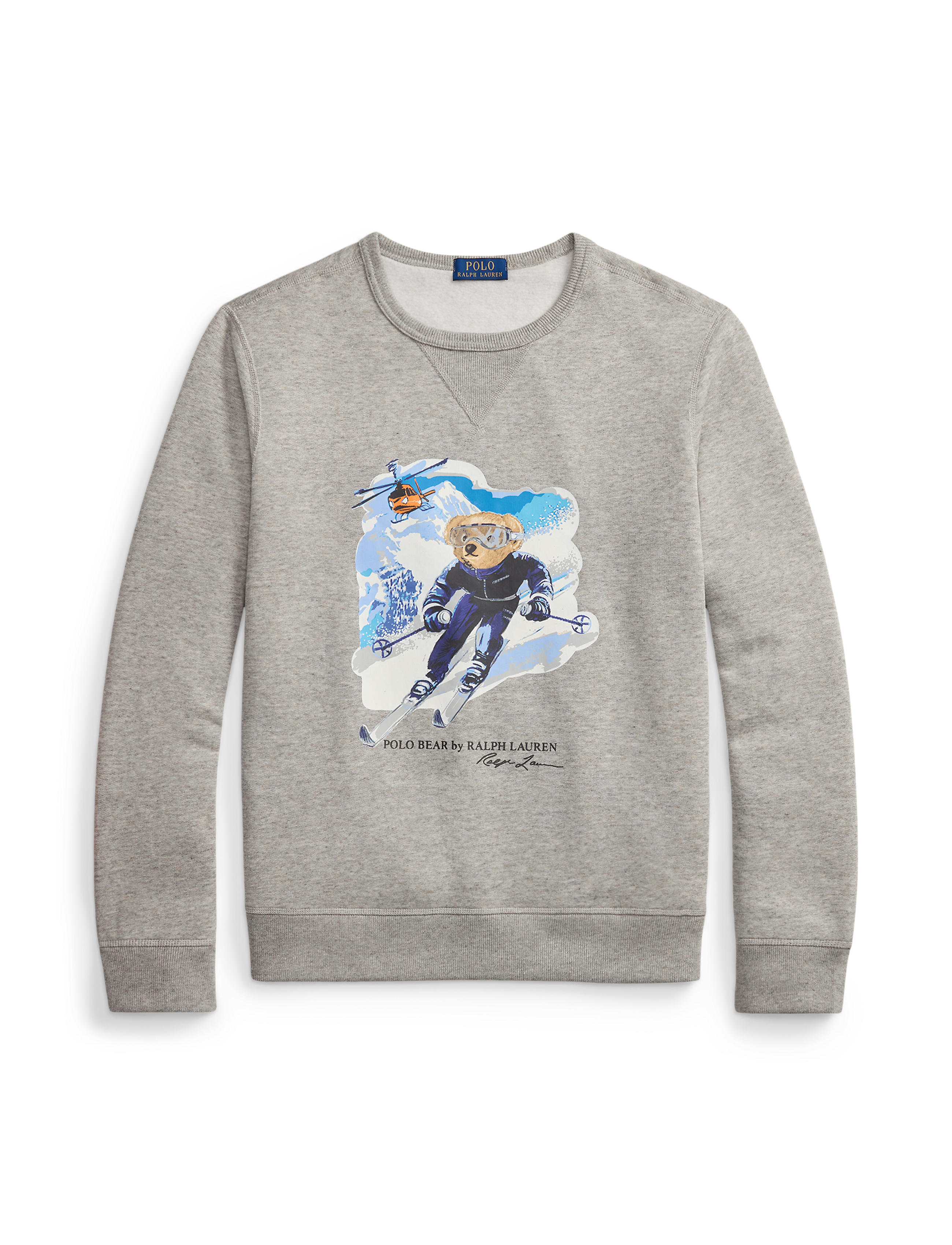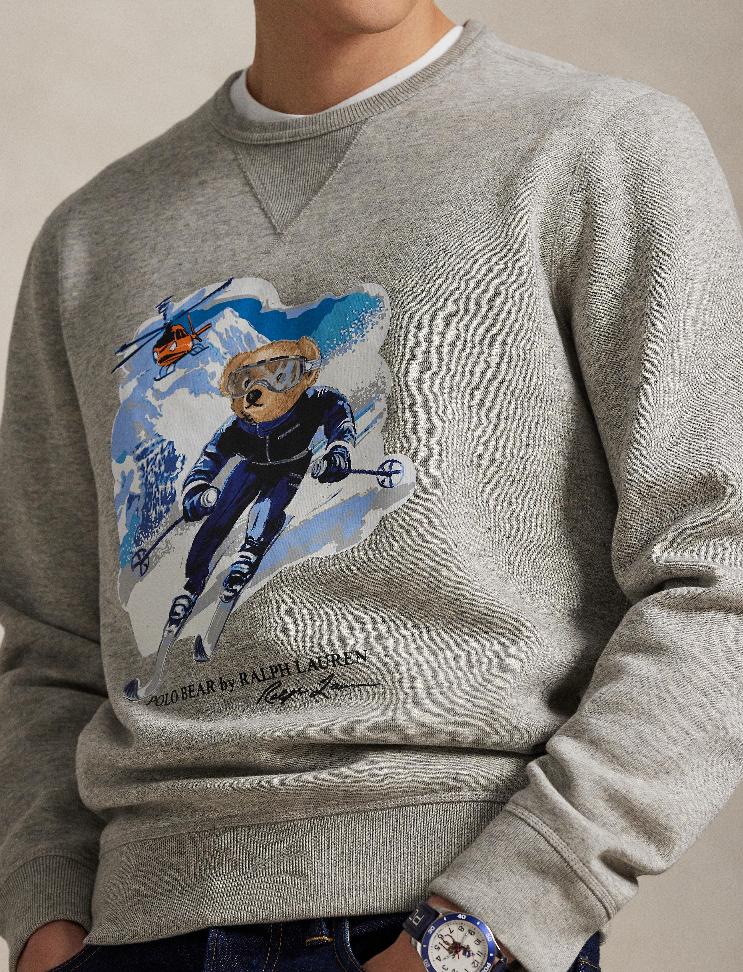 Inspired by classic spy films, this cotton-blend sweatshirt features a snowy landscape with a helicopter and our beloved Polo Bear skiing in style. Size medium has a 27" body length (front and ... Sjá nánar