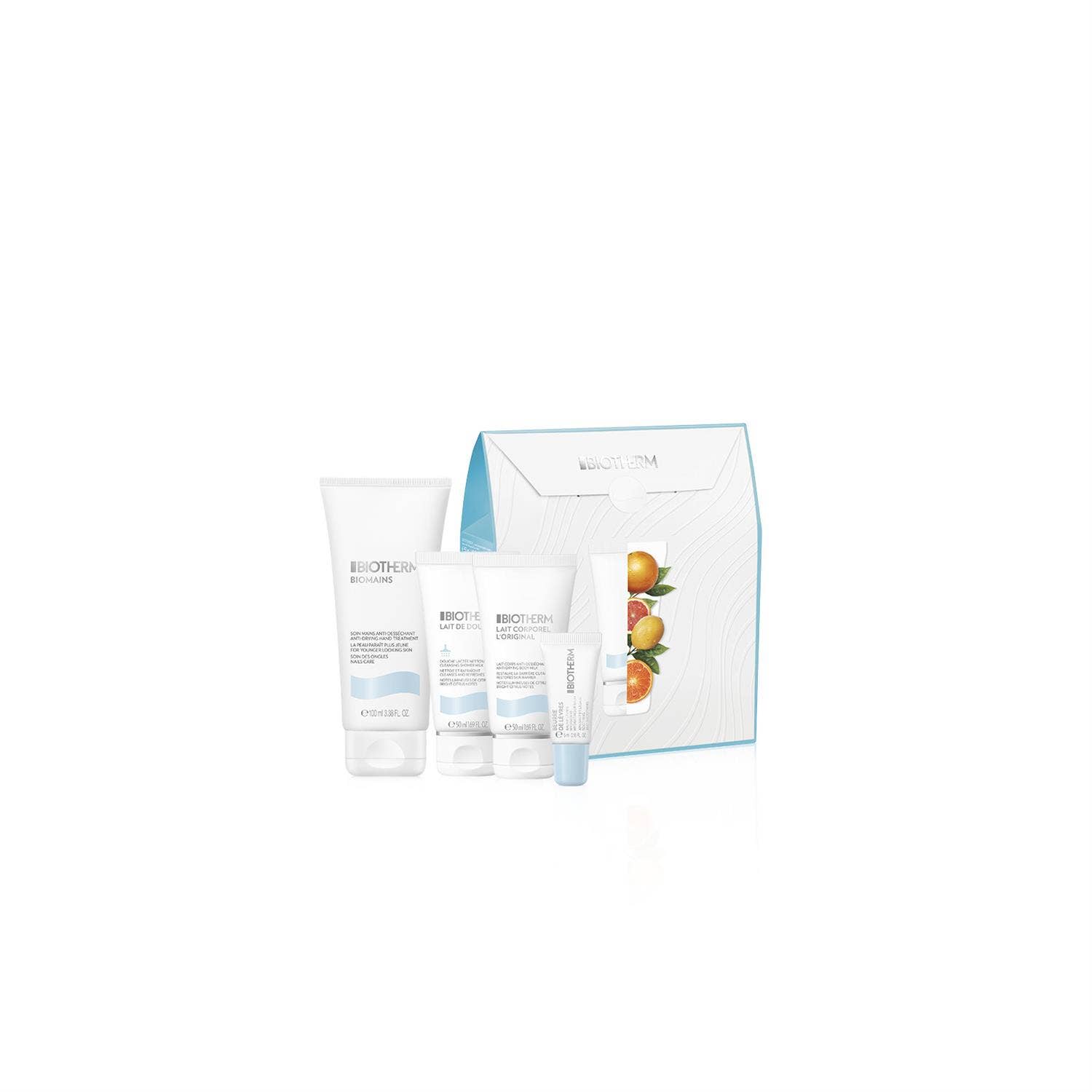 Gjafasettið frá Biotherm inniheldur fjórar vinsælar húðvörur: Lait Corporel Body Milk 50 ml, Lait de Douche 50 ml, Biomains 100 ml og Beurre de Lèvres 5 ml.