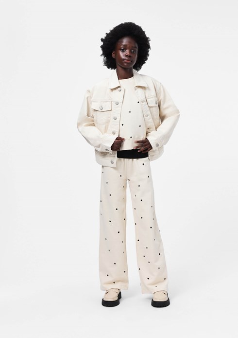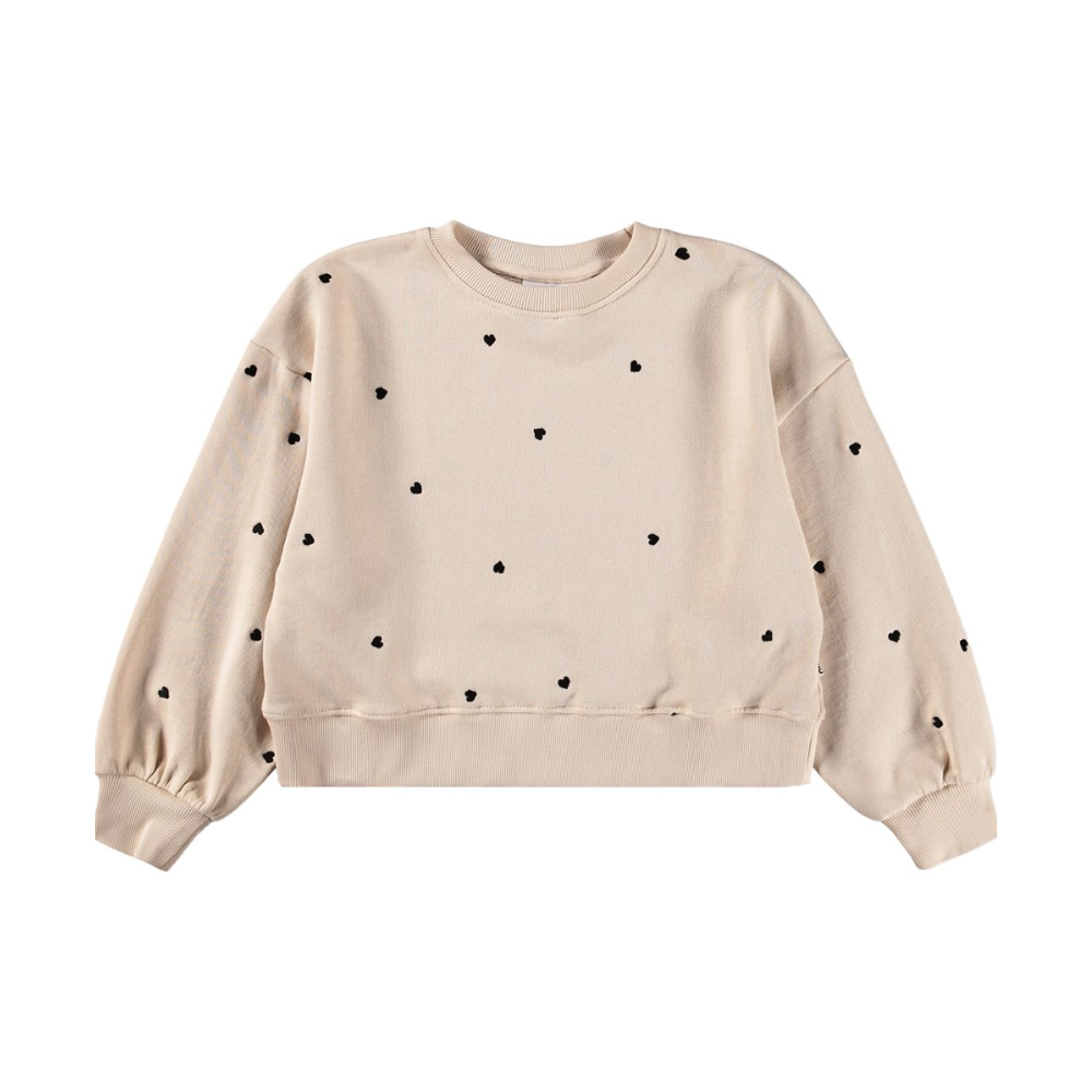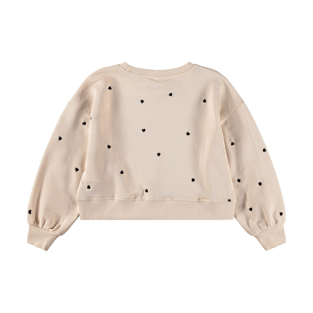 Ljós jogging peysa frá Molo með svörtu útsaumuðu hjartamynstri. 100% bómull.