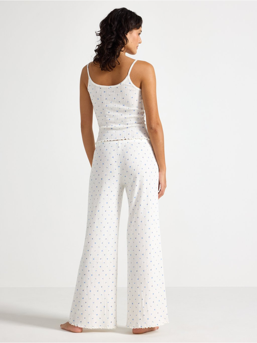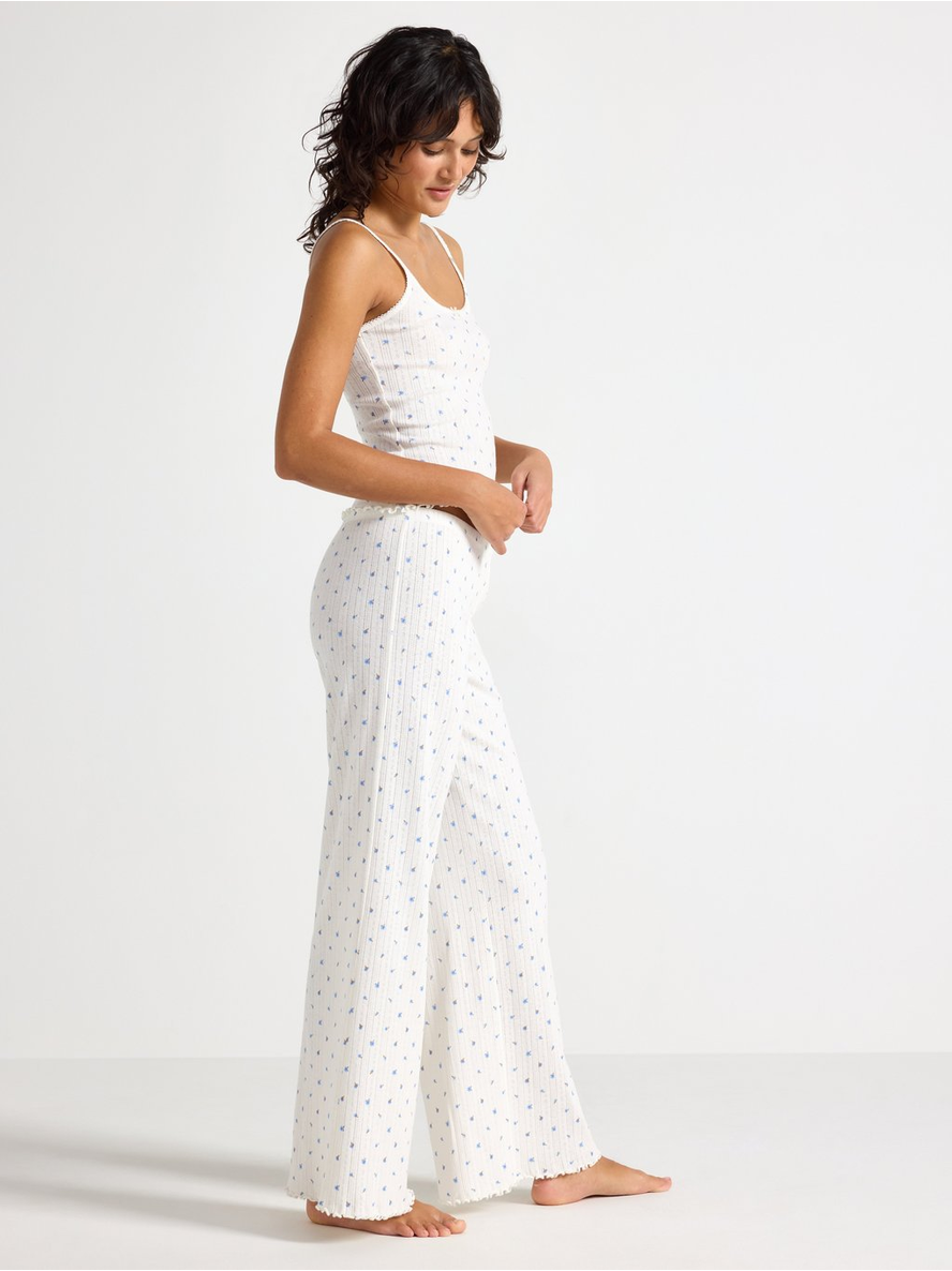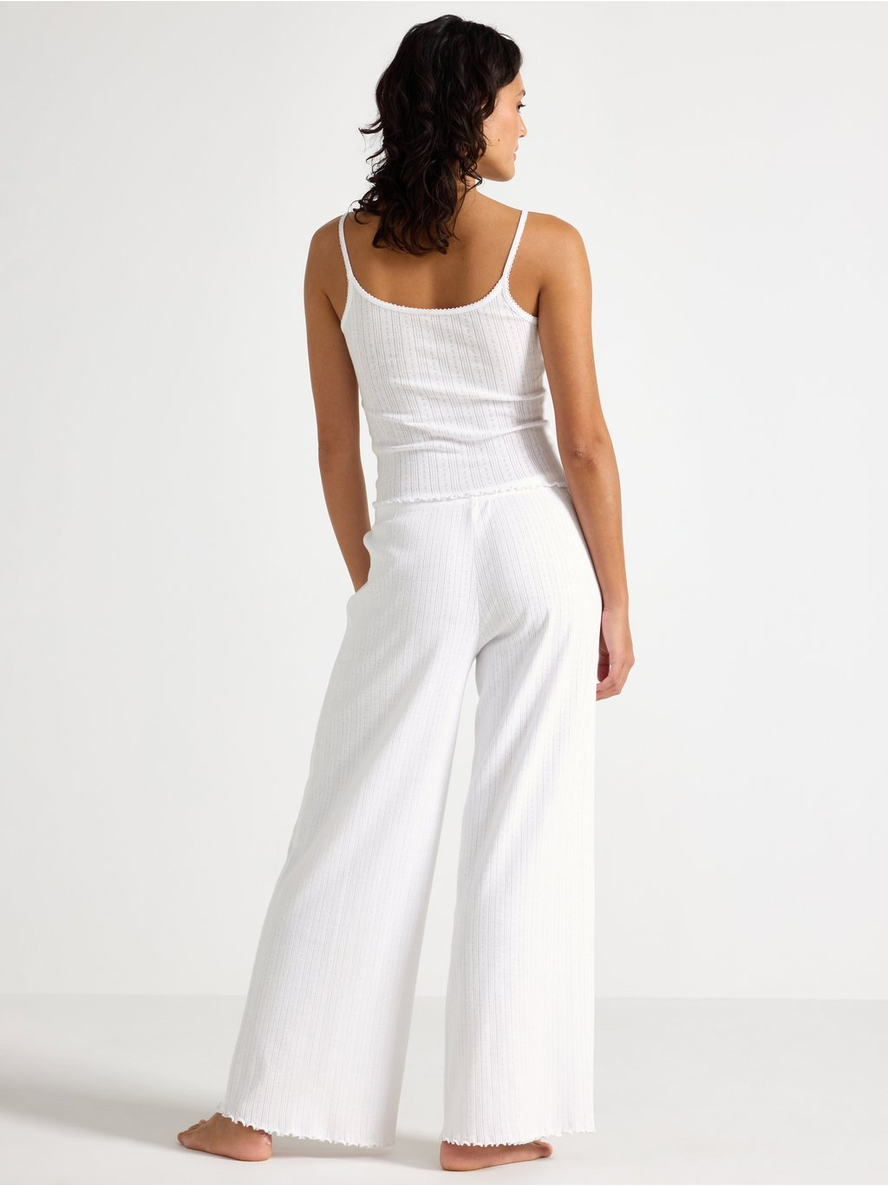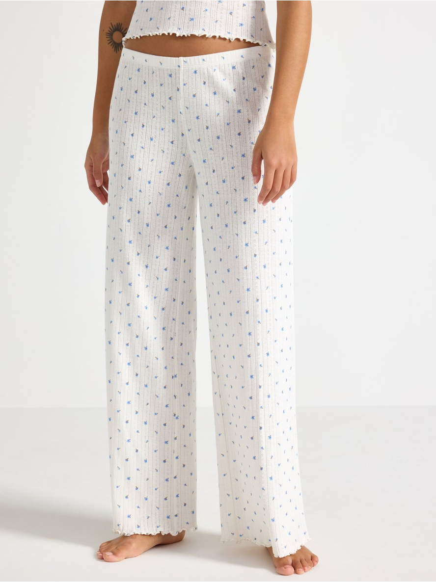 Wide pyjama trousers in pointelle with scalloped edges. Elastic waist Contains 80% Cotton in Conversion Length: 76 cm in size M 100% bómull