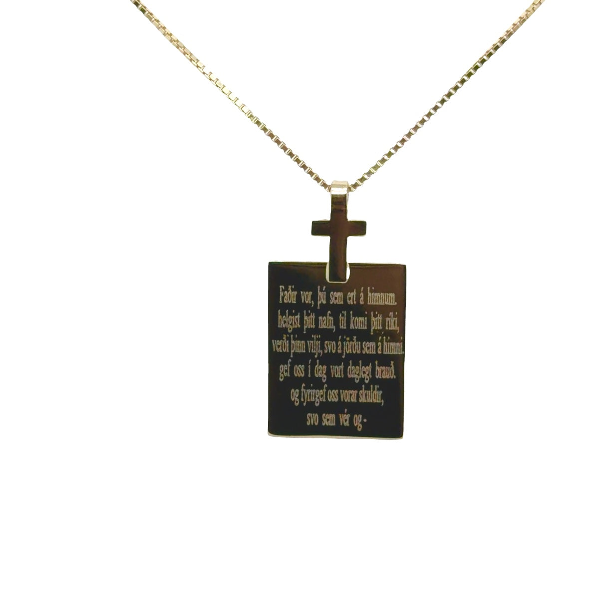 14 kt gulagull plötu men með faðir vorinu Handsmíðað 14 kt gull Á gullhúðaðari silfur keðju 45 til 50 cm