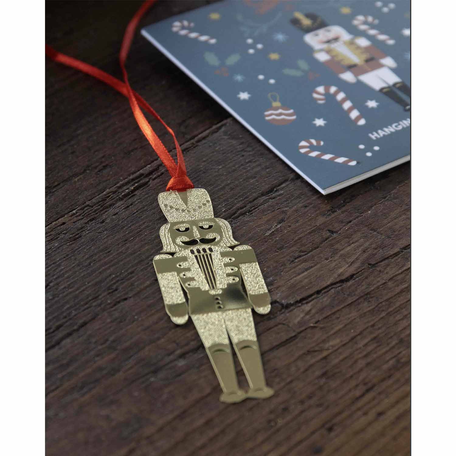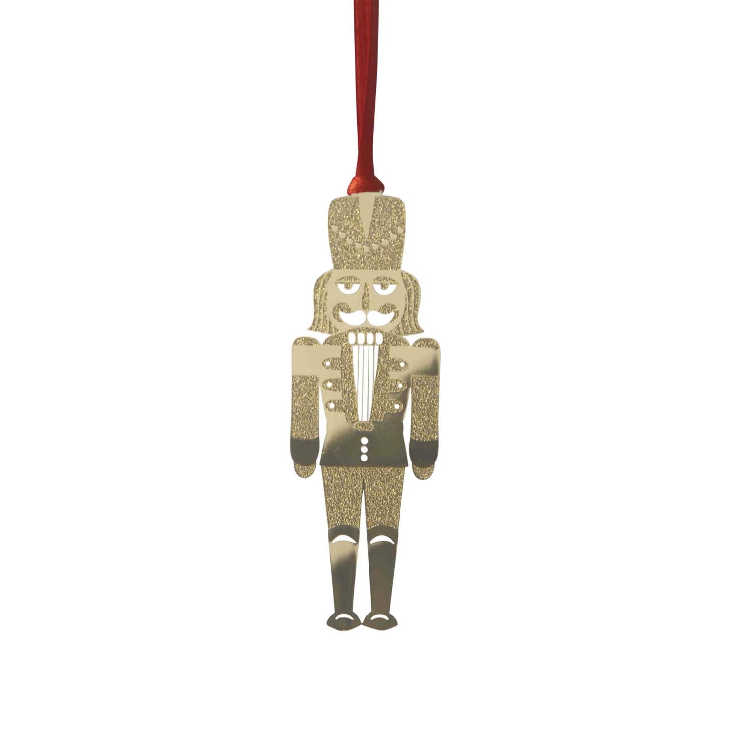 Skrautið er gyllt með rauðum borða. Hæð 12 cm.