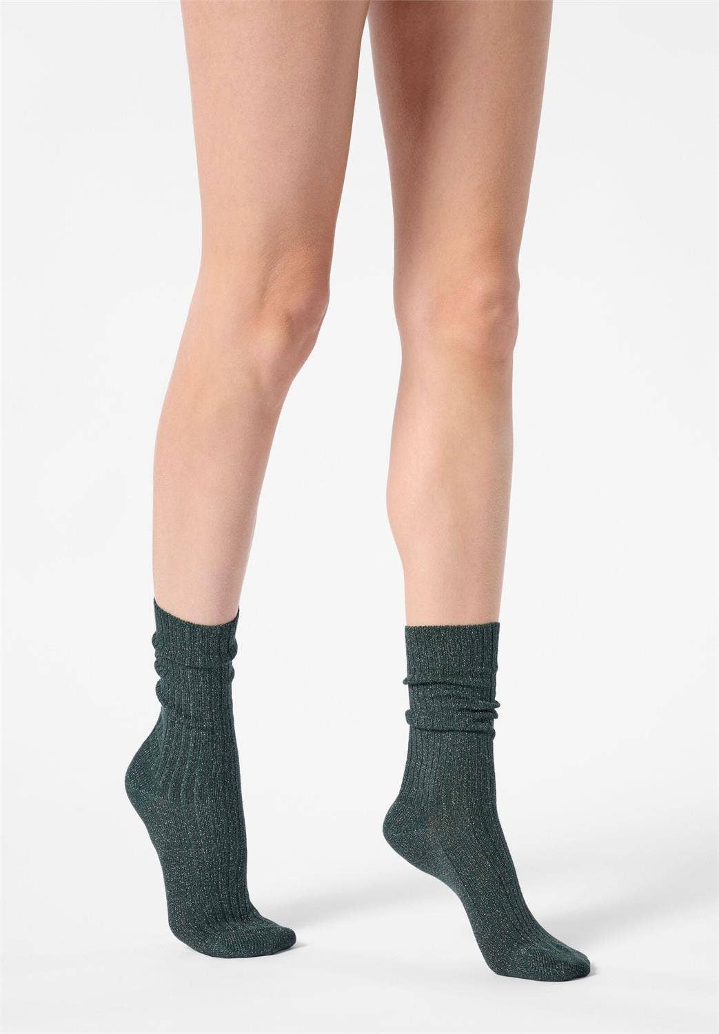 Hálfgegnsæjir 40 den sokkar með einföldum saumum og lamé-þráðum sem gefa mjúka glansandi áferð.