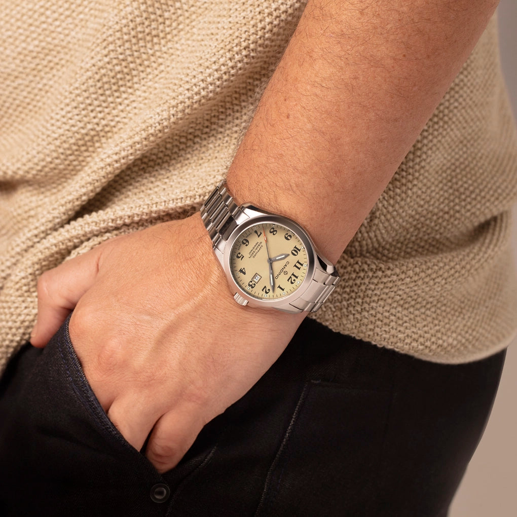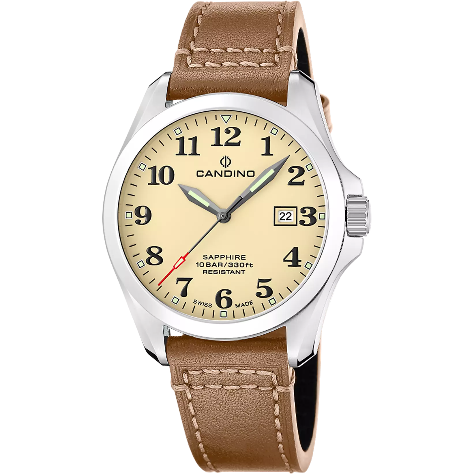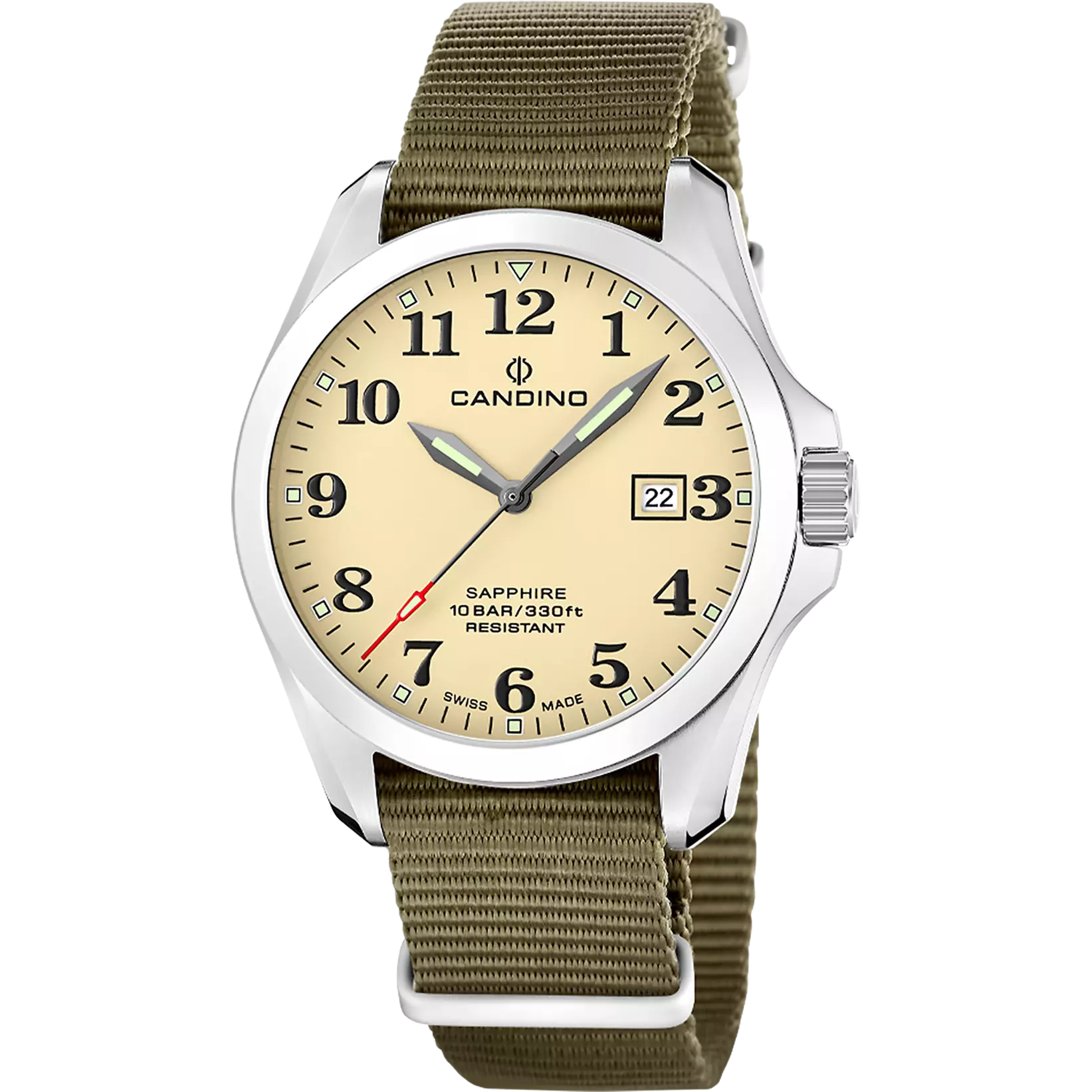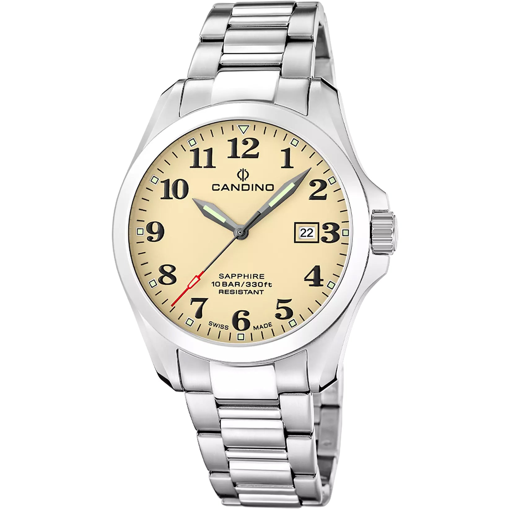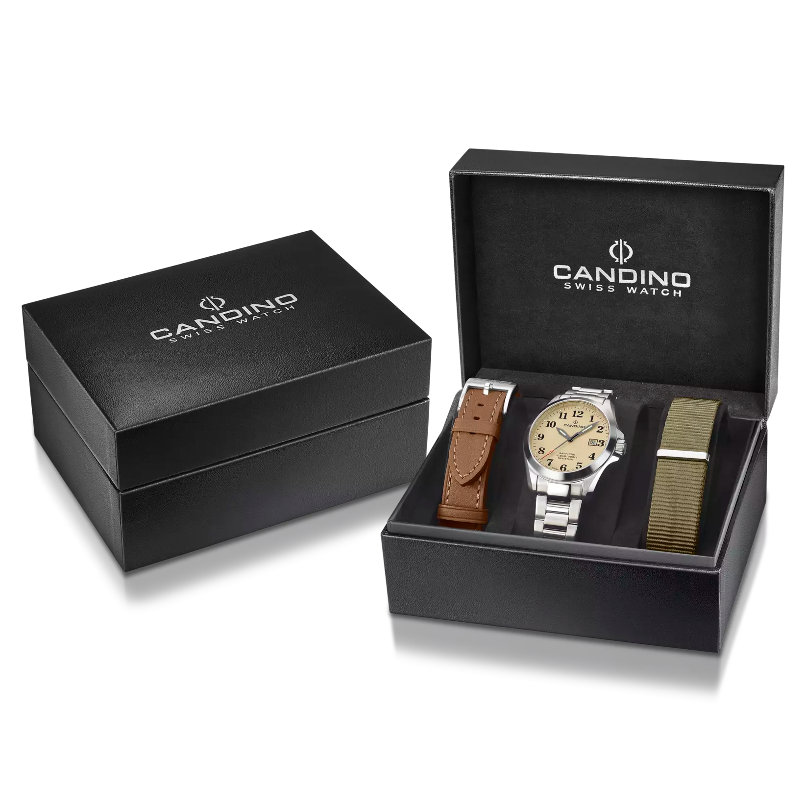 Skemmilegt sett frá svissneska úraframleiðandanum Candino. Úrið kemur á stálkeðju, með fylgja  bæði leður og nato ólar sem er auðvelt að skipta um.
