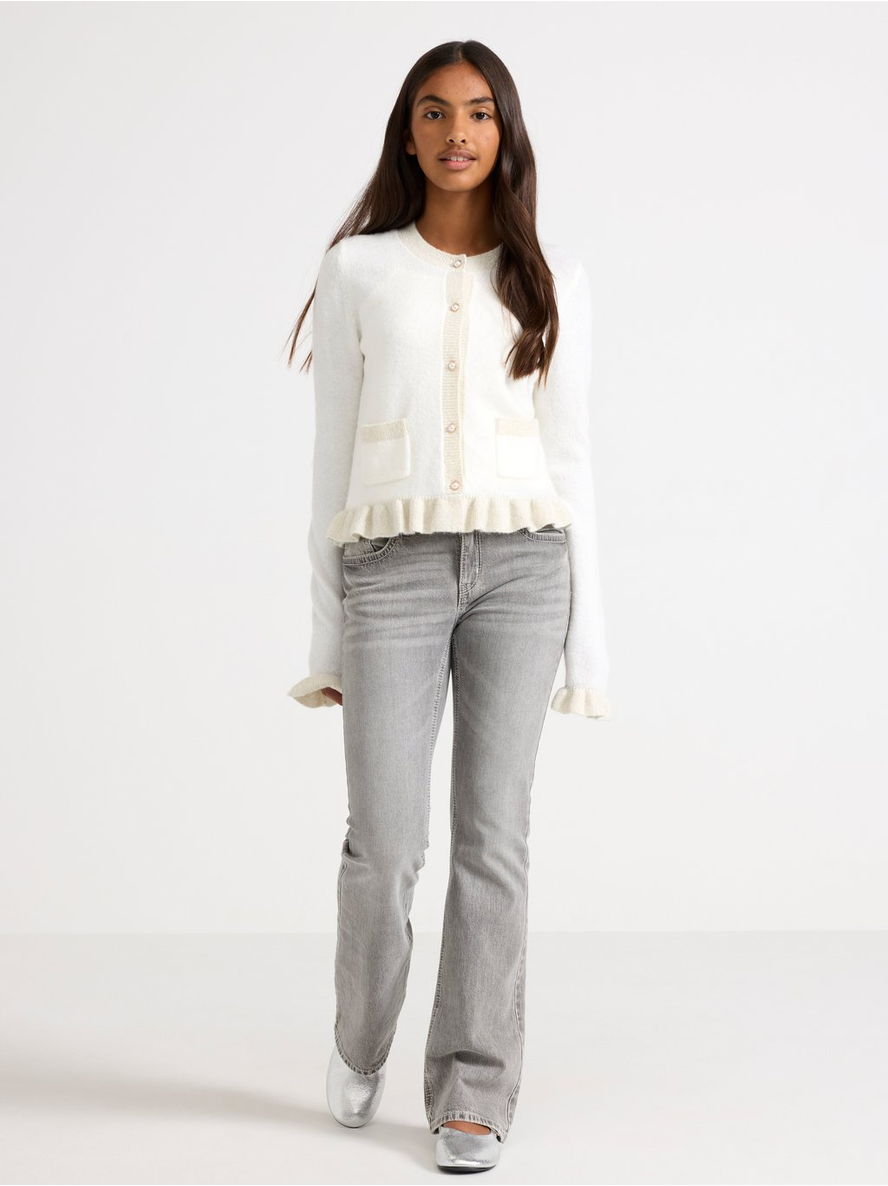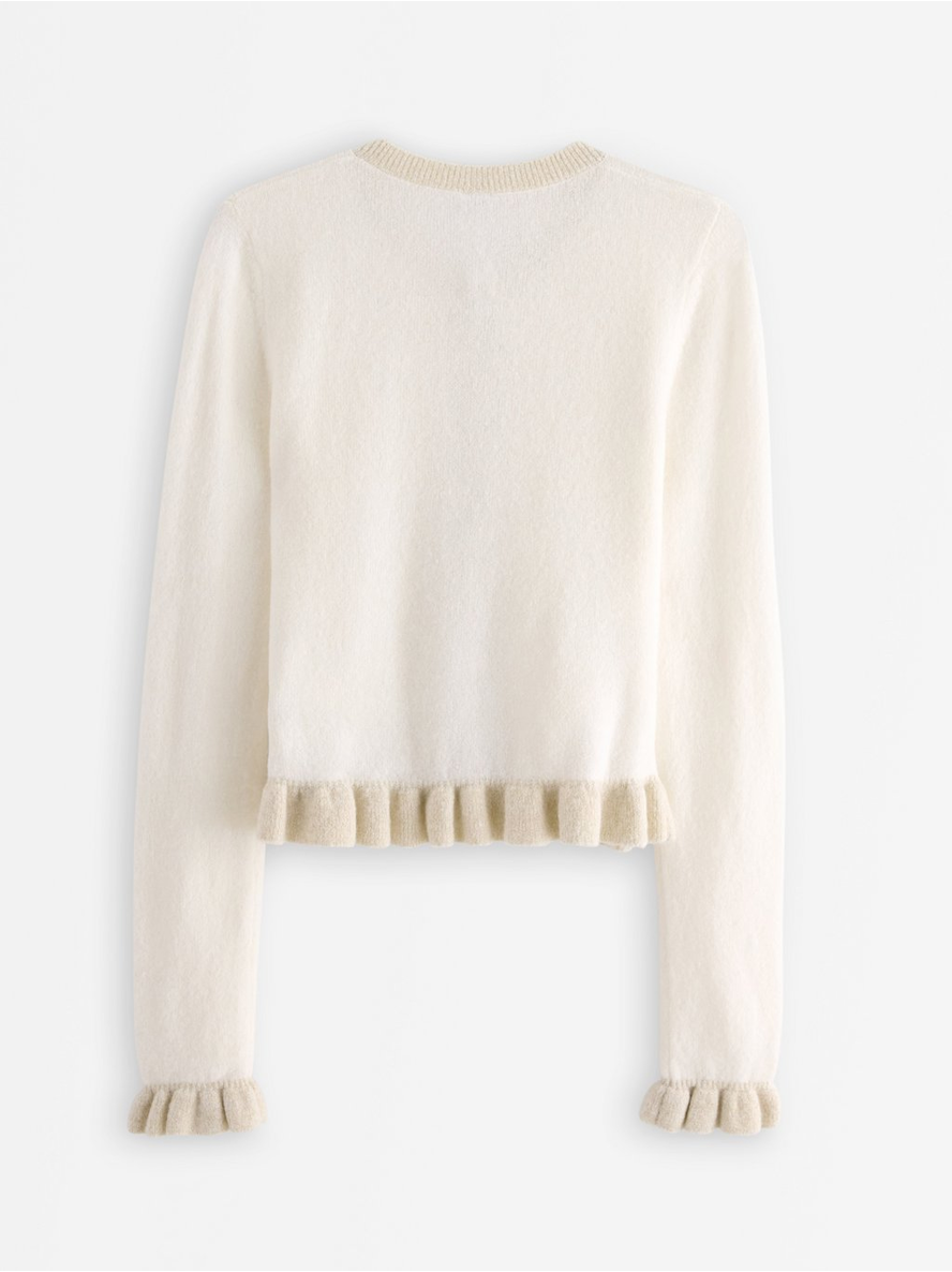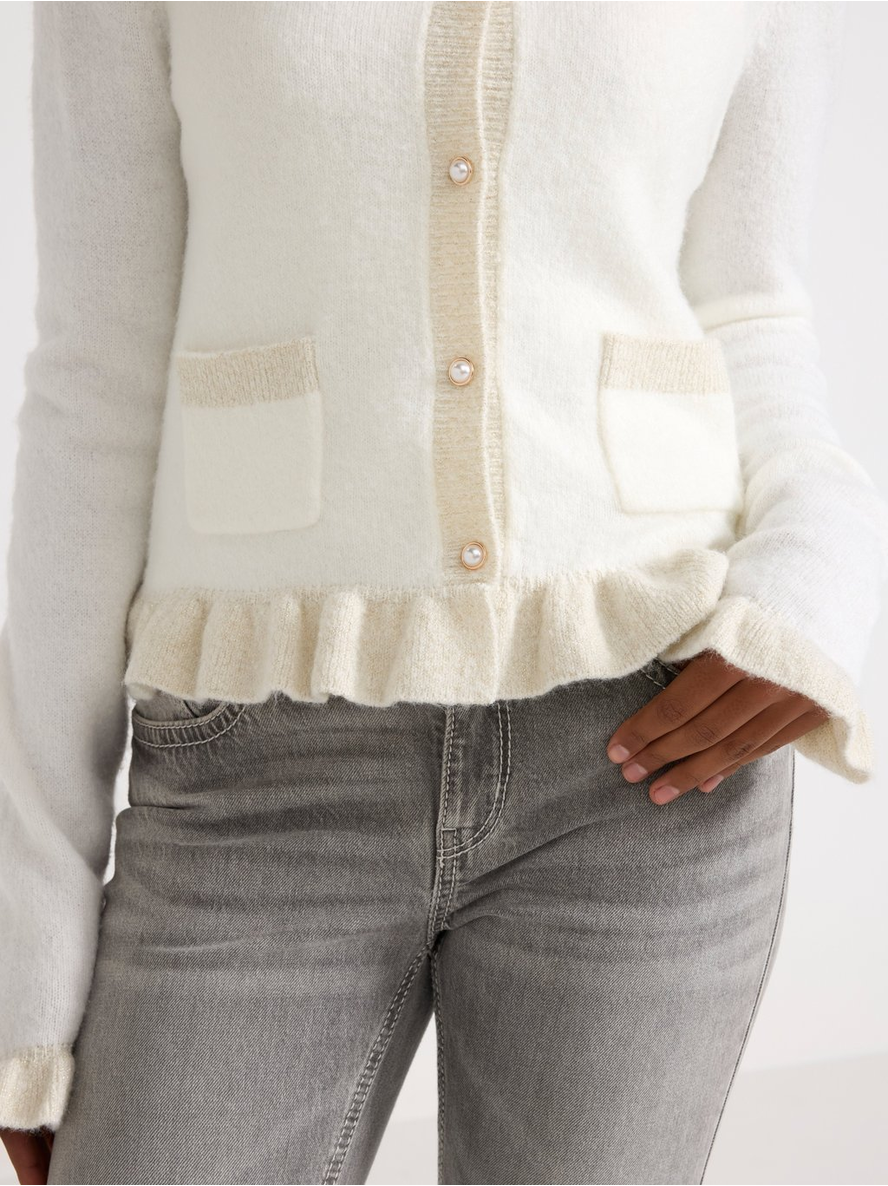 Soft knitted cardigan with frilled edges, lurex details and buttons down the front. Round neckline Long sleeves Contains 50% recycled polyester 50% pólýester 42% akríl 5% málmur ... Sjá nánar