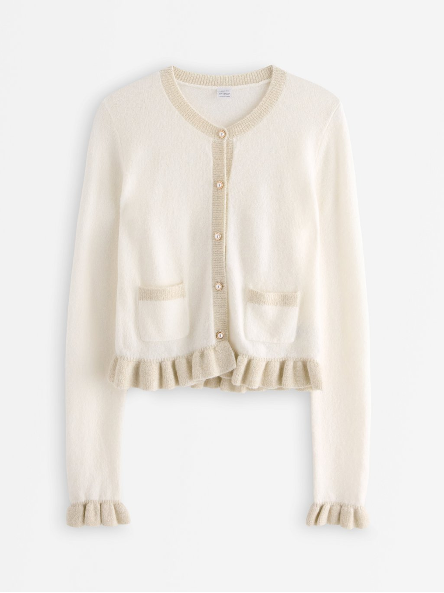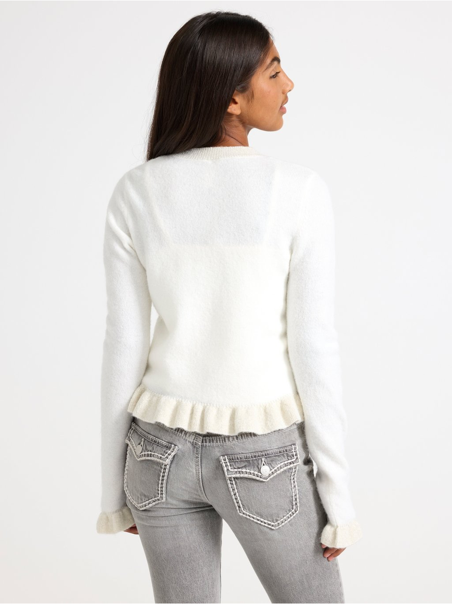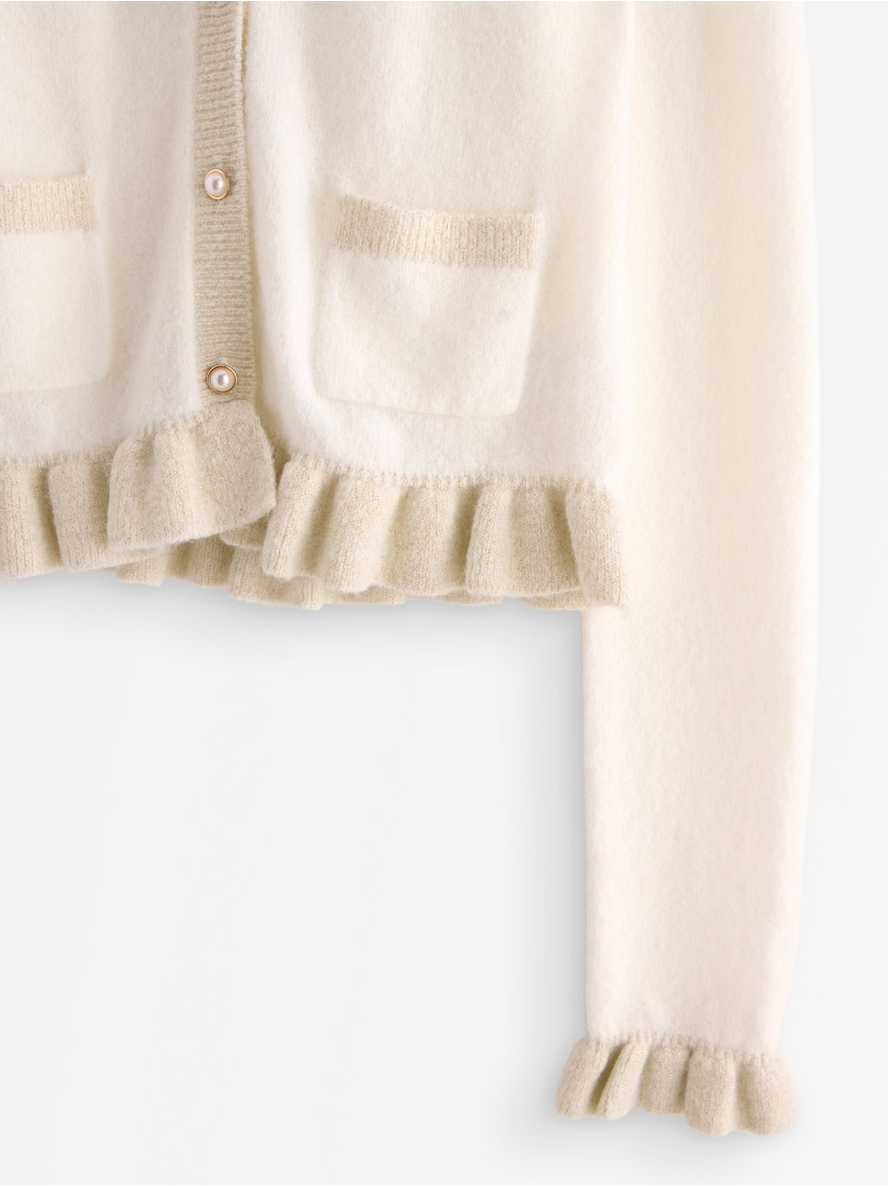 Soft knitted cardigan with frilled edges, lurex details and buttons down the front. Round neckline Long sleeves Contains 50% recycled polyester 50% pólýester 42% akríl 5% málmur ... Sjá nánar