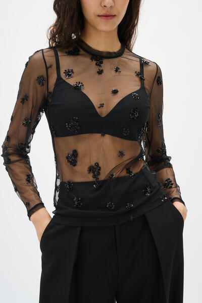 Falleg gegnsæ blússa frá InWear með pallíettublómum.
