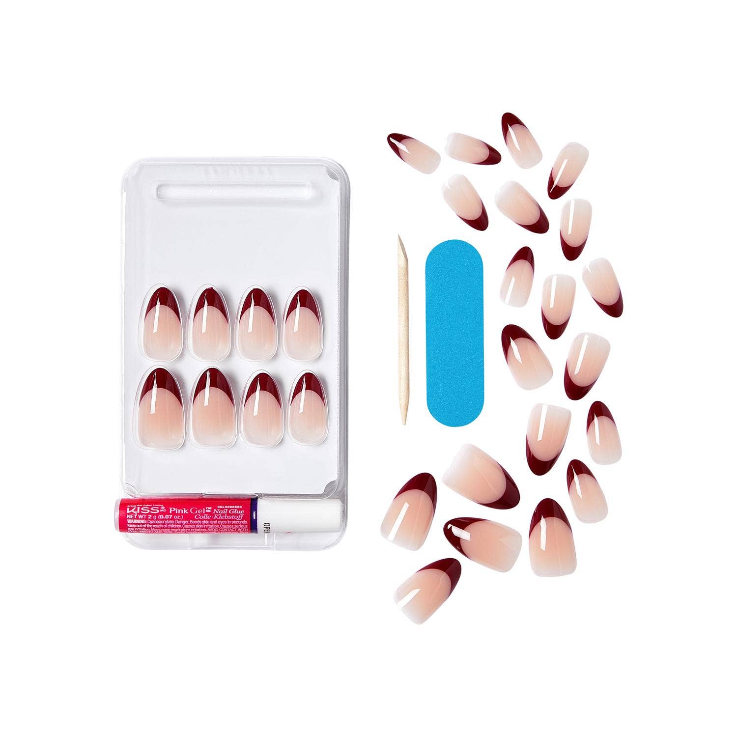 28 miðlungs langar akrýl gervineglur með vínrauðu french.