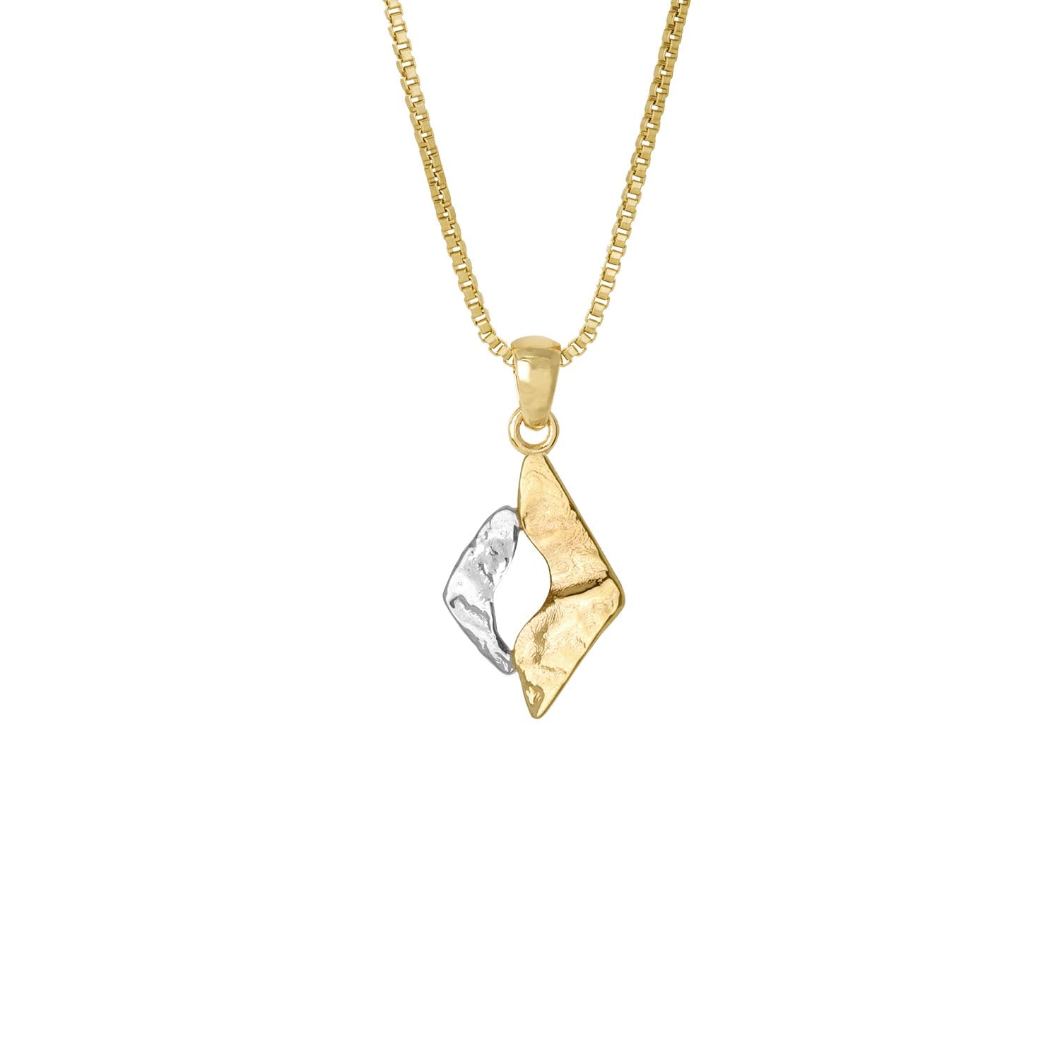 Hálsmenið er handsmíðað úr 14 karta gulli og hvítagulli. Hæð mensins er um 14 mm. Hönnuður og smiður er Berglind Snorra.