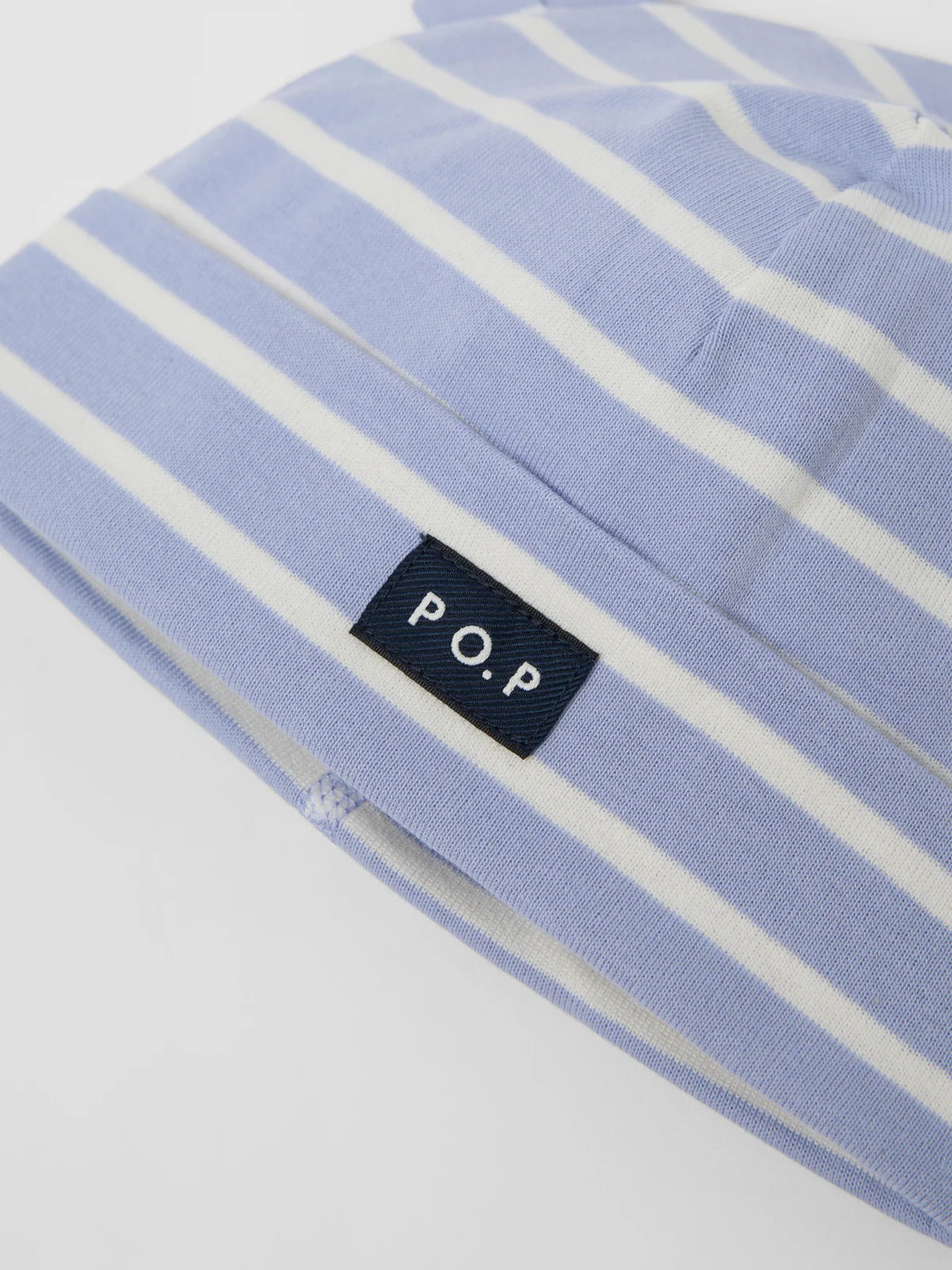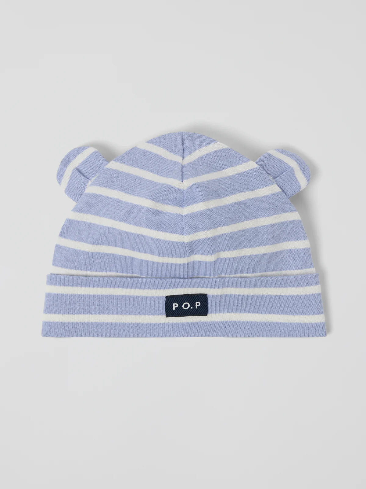 Stripey beanie with ears A classic in a new colour Striped beanie hat in 100% organic cotton jersey for your little one. This hat is adorned with ears and has a foldup brim that can be ... Sjá nánar