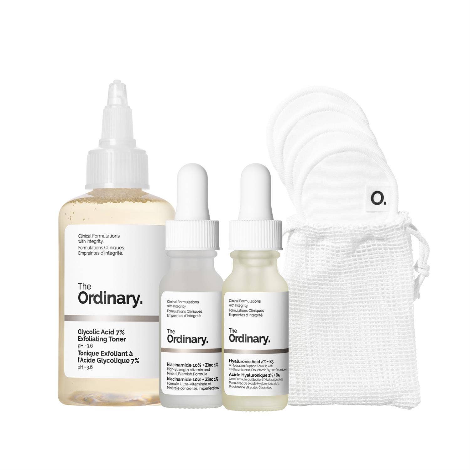 Gjafasett frá Ordinary sem inniheldur: -Glycolic Acid 7% Exfoliating Toner, 100ml -Niacinamide 10% + Zinc 1%, 15ml -Hyaluronic Acid 2% + B5, 15ml