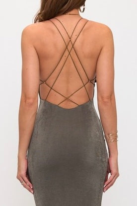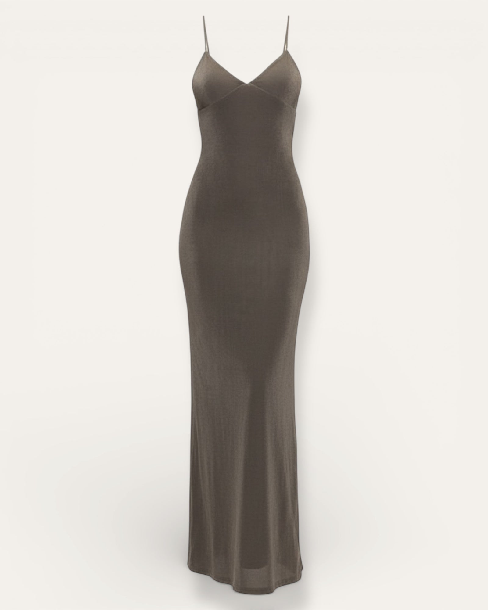 Minimalískur maxi kjóll með opnu baki    Einfaldur en ótrúlega sexy maxi kjóll með mjóum spaghettí-ólum og fallegu V-hálsmáli. Kjóllinn er aðsniðinn og leggst mjúklega að líkamanum sem ... Sjá nánar