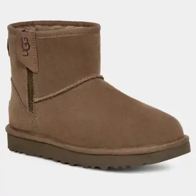 Klassísku Mini skórnir frá UGG með rennilás á hliðinni sem auðveldar ferlið að smeygja sér í skóna.