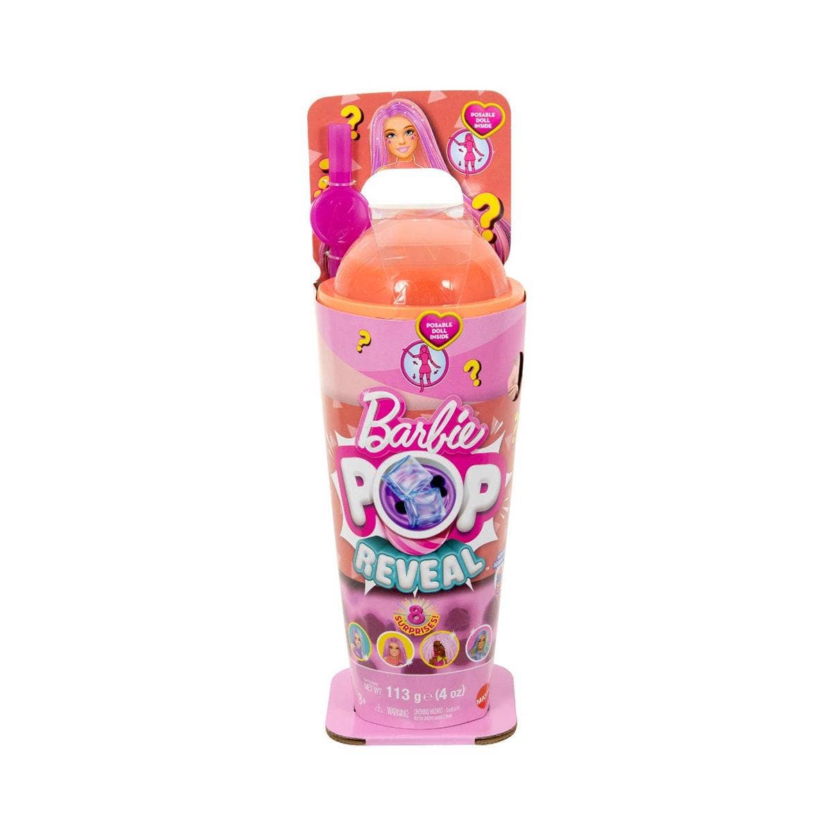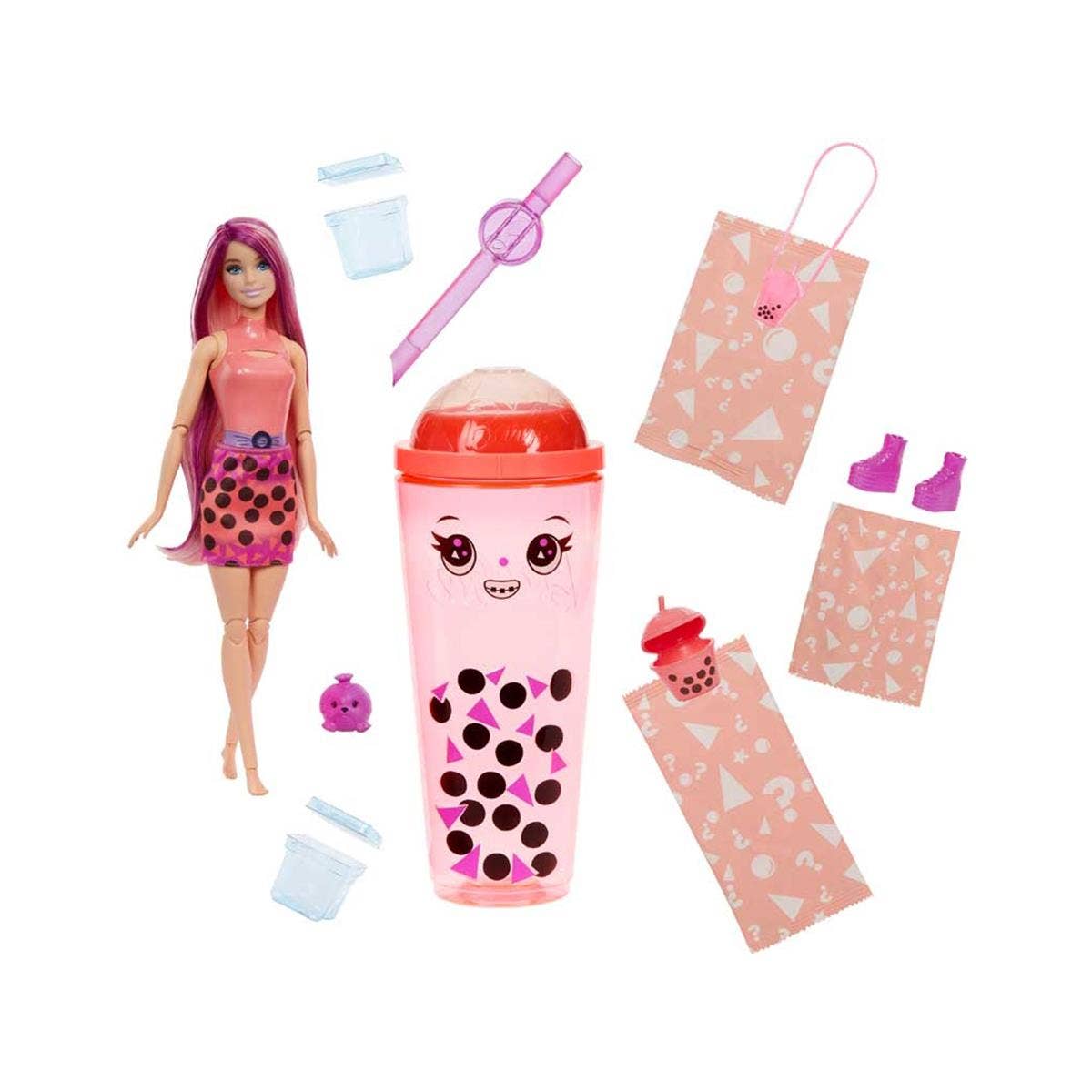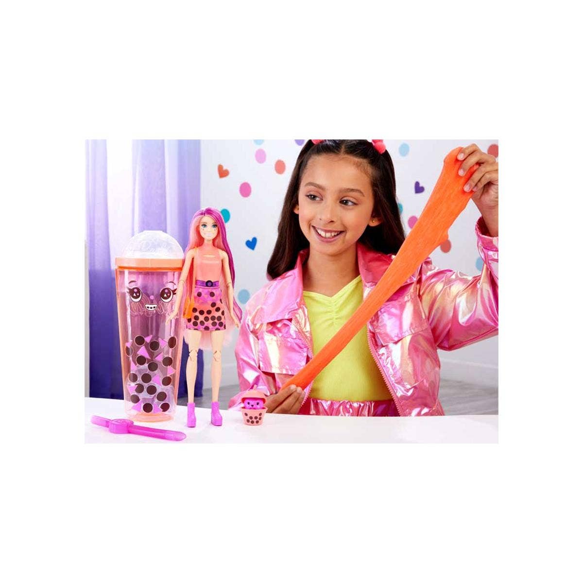 Flott Barbie dúkka í bleiku og appelsínugulu Boba Tes glasi.