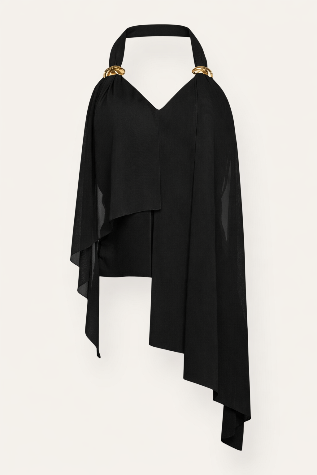 Glæsilegur halter toppur með fallegu ósamhverfu sniði og gylltum smáatriðum við axlir. Létt og flæðandi efni sem fellur fallega og skapar fágað og kvenlegt útlit. Fullkominn bæði við ... Sjá nánar