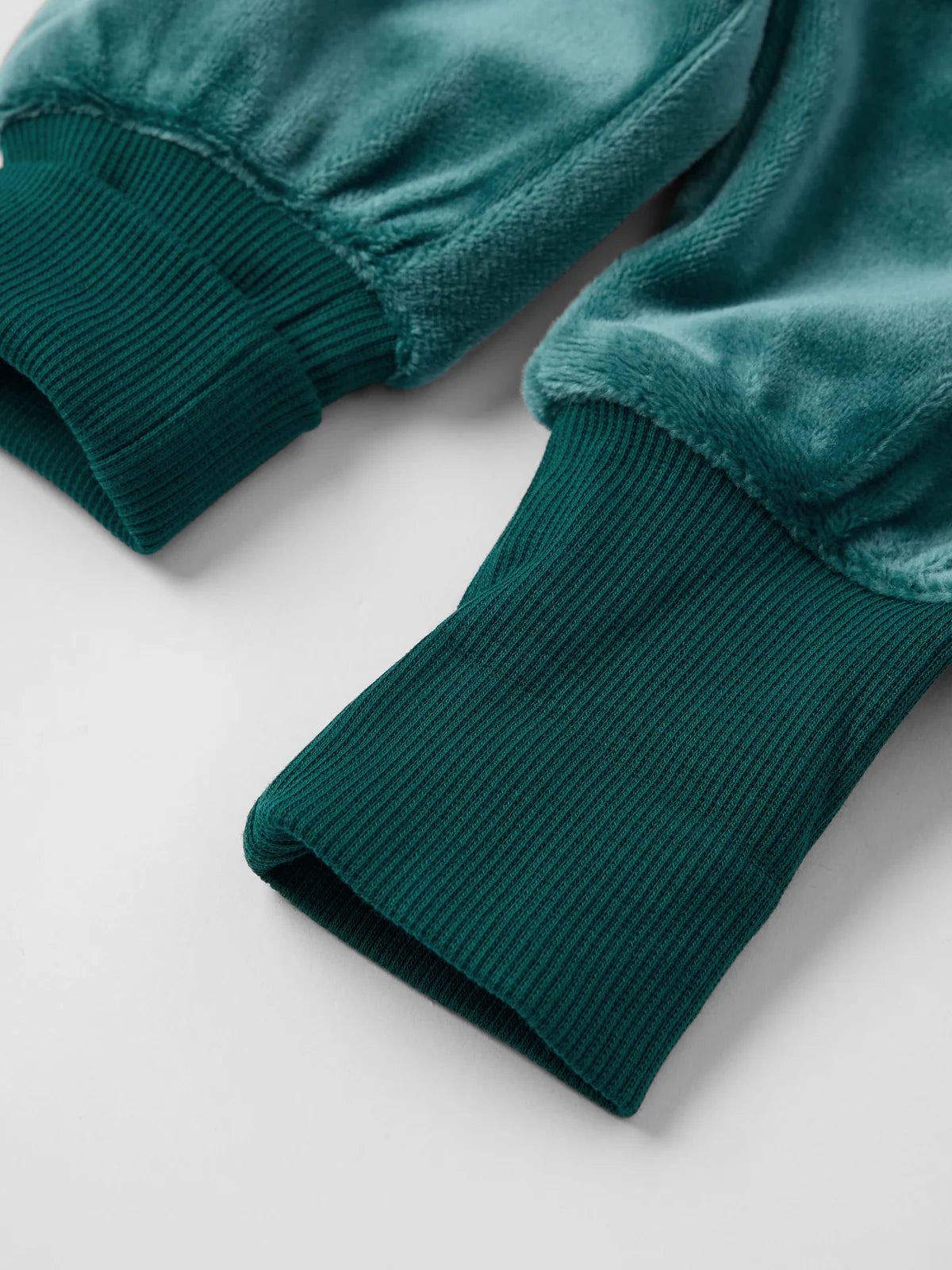Cosy and play-friendly Soft velour with extra long cuffs Soft and cosy velour trousers made from recycled polyester – perfect for small, growing legs. The trousers have an elastic waist that ... Sjá nánar