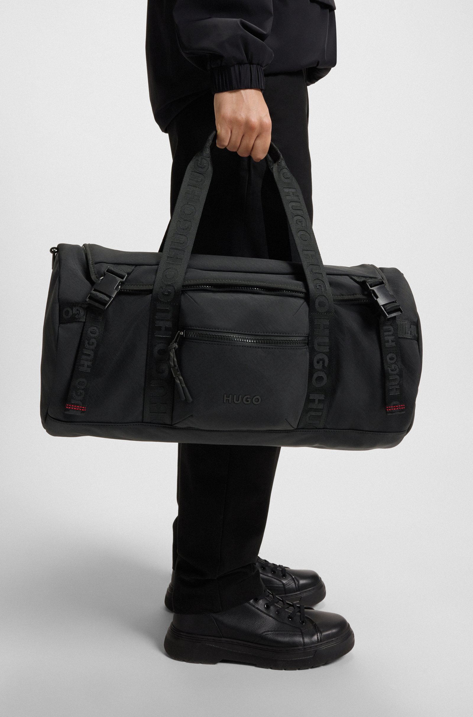 This HUGO Menswear holdall is perfect for the gym or weekends away. Soft nylon with a logo and branded straps. Detachable shoulder strap. Secure buckles. Length: 52,0 cm (20.5 inches) Width: ... Sjá nánar