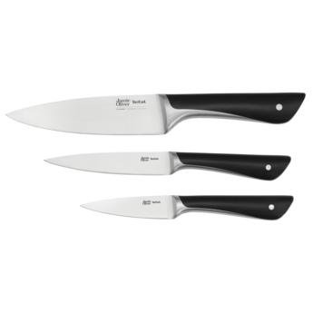 Tefal Jamie Oliver hnífasett með þremur hnífum. Settið inniheldur 15cm kokkahníf, 12cm skurðarhníf og 9cm alhliðahníf.