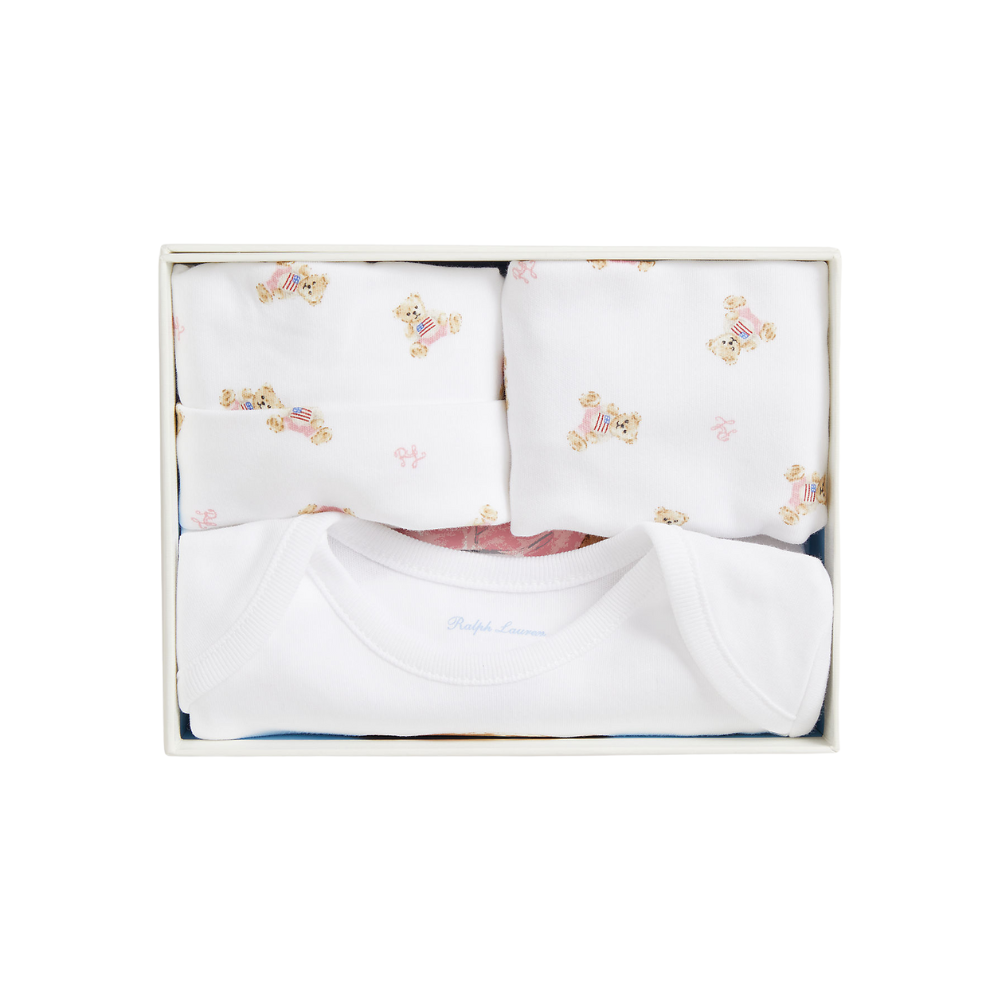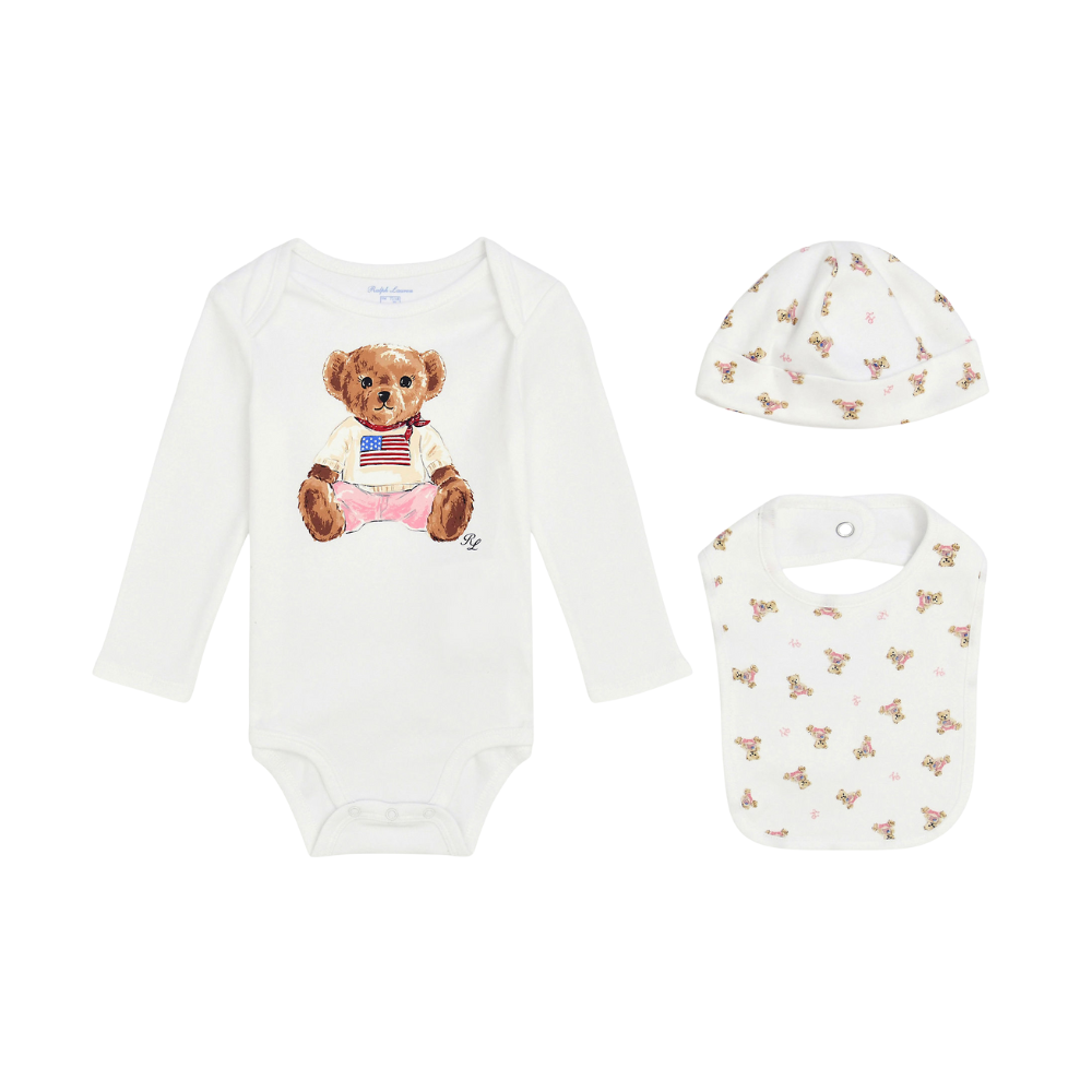 Fallegt gjafasett frá Polo Ralph Lauren. Settið kemur í fallegum kassa og inniheldur samfellu, húfu og smekk. 100% bómull.