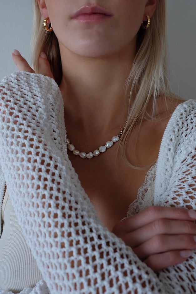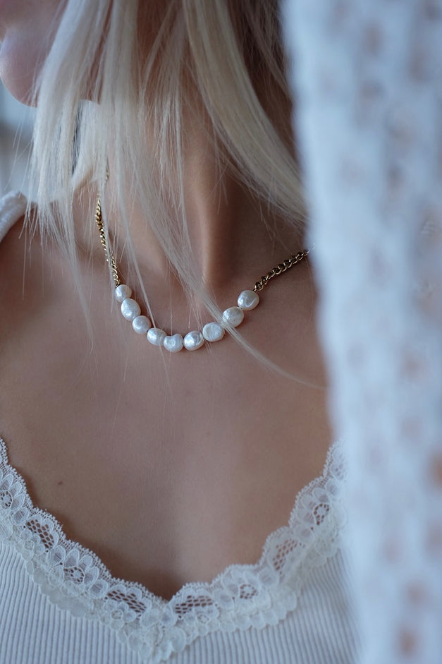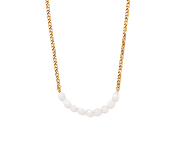 Hálsmen - 1104 by MAR GUÐ0410 GUÐ keðjan er hin fullkomna samsetning af ferskvatnsperlum og nettri keðju. Perluröðin er miðjusett á hálsmeninu. Stílhrein og elegant og fer vel með öðrum ... Sjá nánar