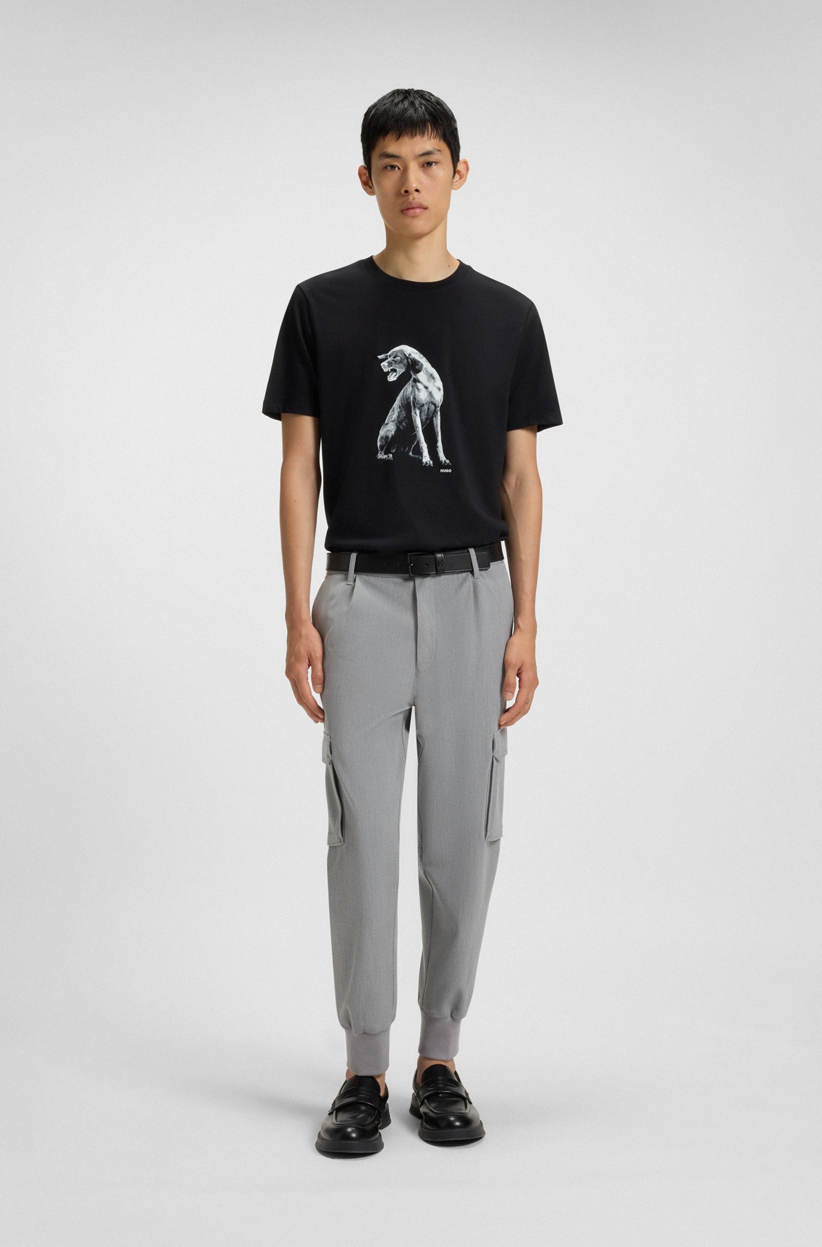 This HUGO Menswear T-shirt is printed with dog artwork across the chest for modern impact. Made in breathable cotton jersey. Regular fit Regular fit Neckline: Crew neck Short sleeves Standard ... Sjá nánar