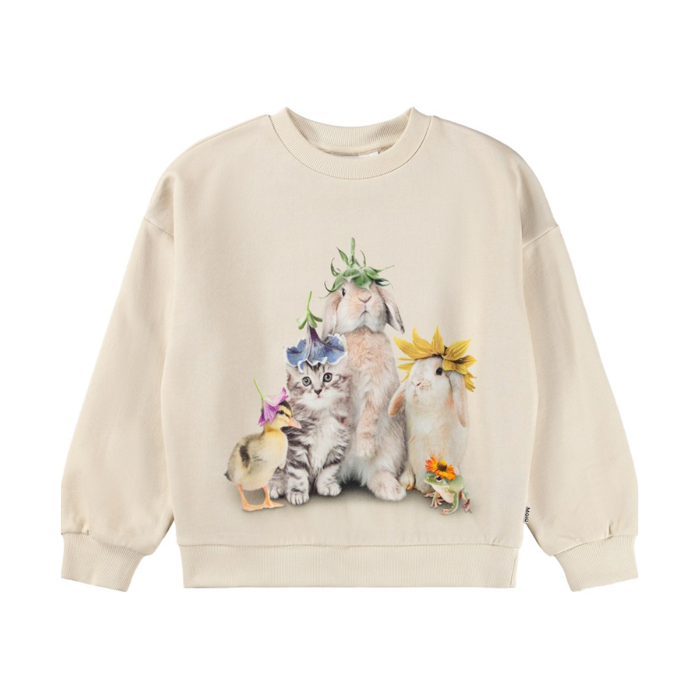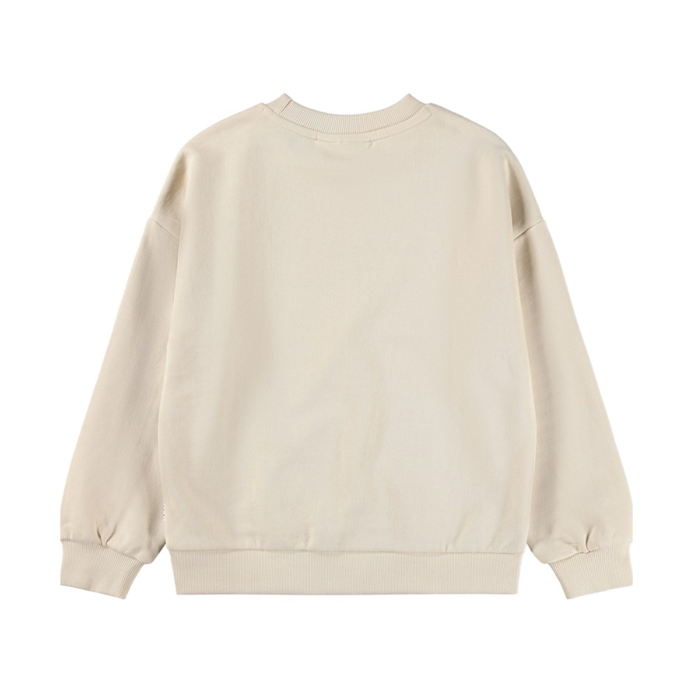 Ljós Molo peysa með sætri mynd að framan. Stroff við ermar og mitti. 100% bómull.