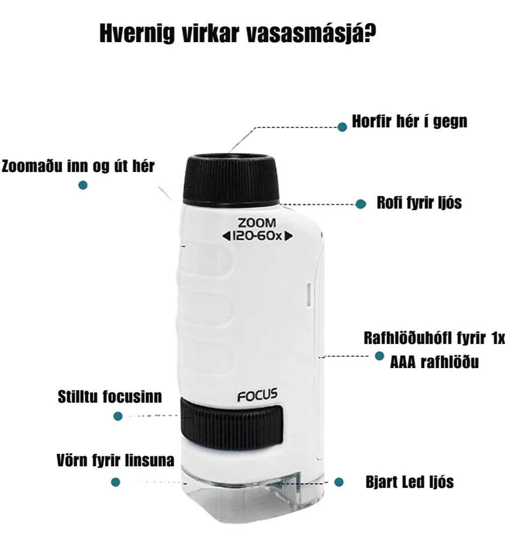 Vasasmásjáin er lítil en öflug smásjá sem er fullkomin fyrir litla vísindamanninn. 60-120x Stækkun gefur þér sýn inn í nýjan heim. Þar sem þetta er smásjá þá þarf að setja það sem á að ... Sjá nánar