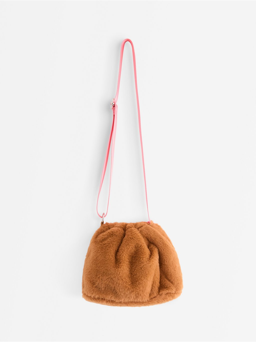 Fluffy bag with shoulder strap and one compartment. One compartment Adjustable shoulder strap 100% pólýester