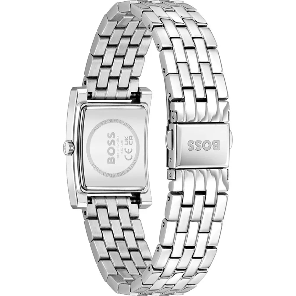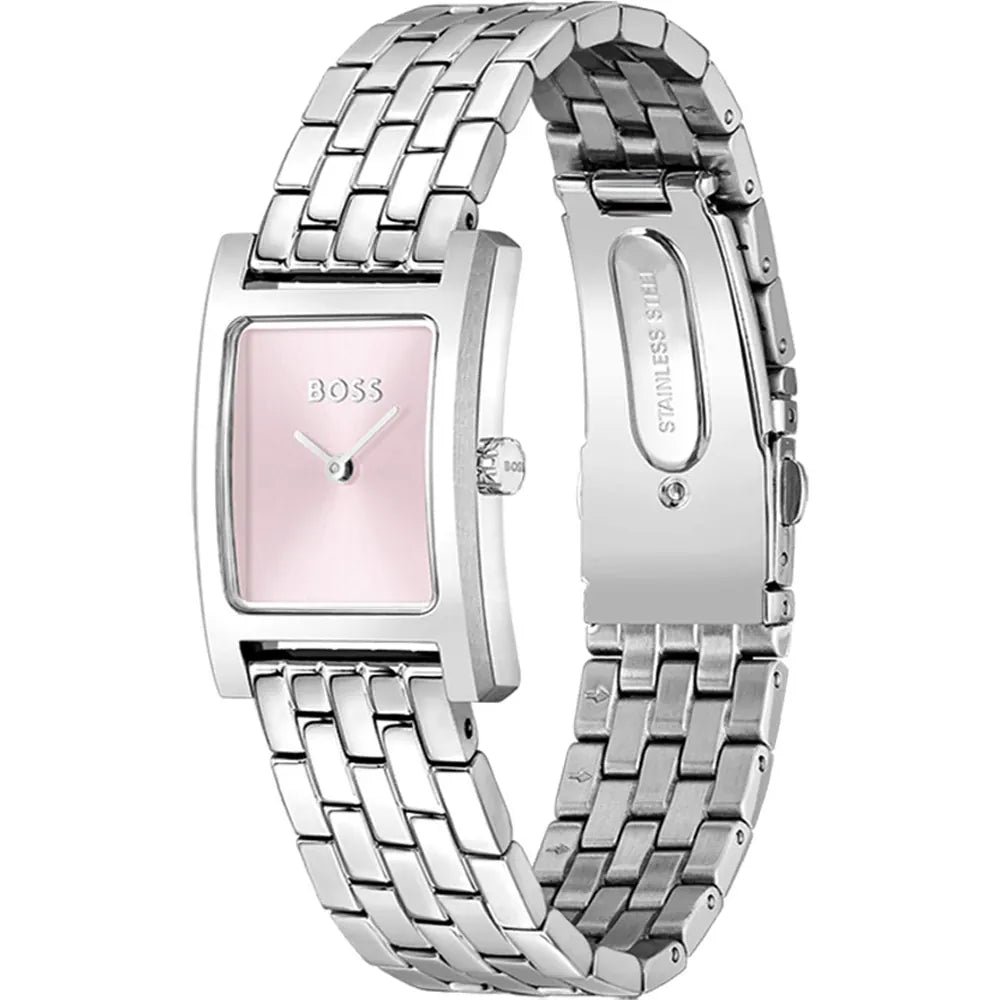 Hugo Boss Lucy Vörunr:1502743 Fallegt dömuúr frá Hugo Boss. Gangverk:Rafhlaða/Quartz Stærð:23mm Úrkassi:Stál  Keðja/ól:Stál Skífa:Bleik Gler:Hert gler Vatnsvörn:30m Dagatal:Nei   ... Sjá nánar