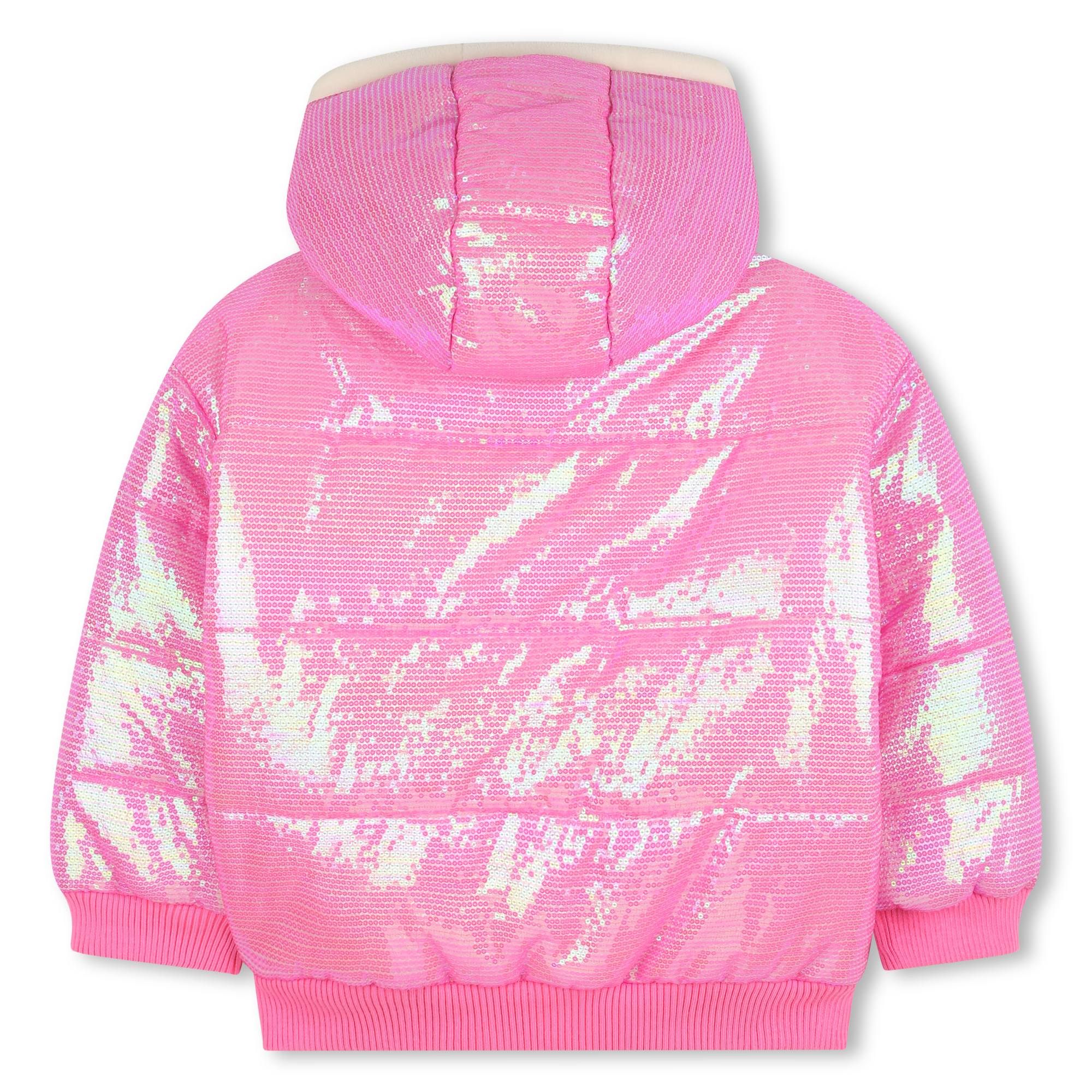 Bleikur palliettu jakki frá Billieblush. Jakkinn er renndur og með hettu. 100% polyester.