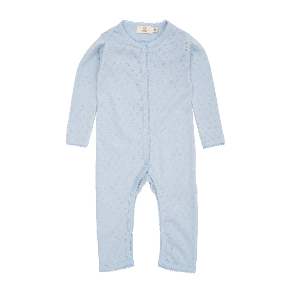 Ljós blár heilgalli með smáu gatamynstri frá Copenhagen Colors. Gallinn er smelltur að framan. 100% bómull.