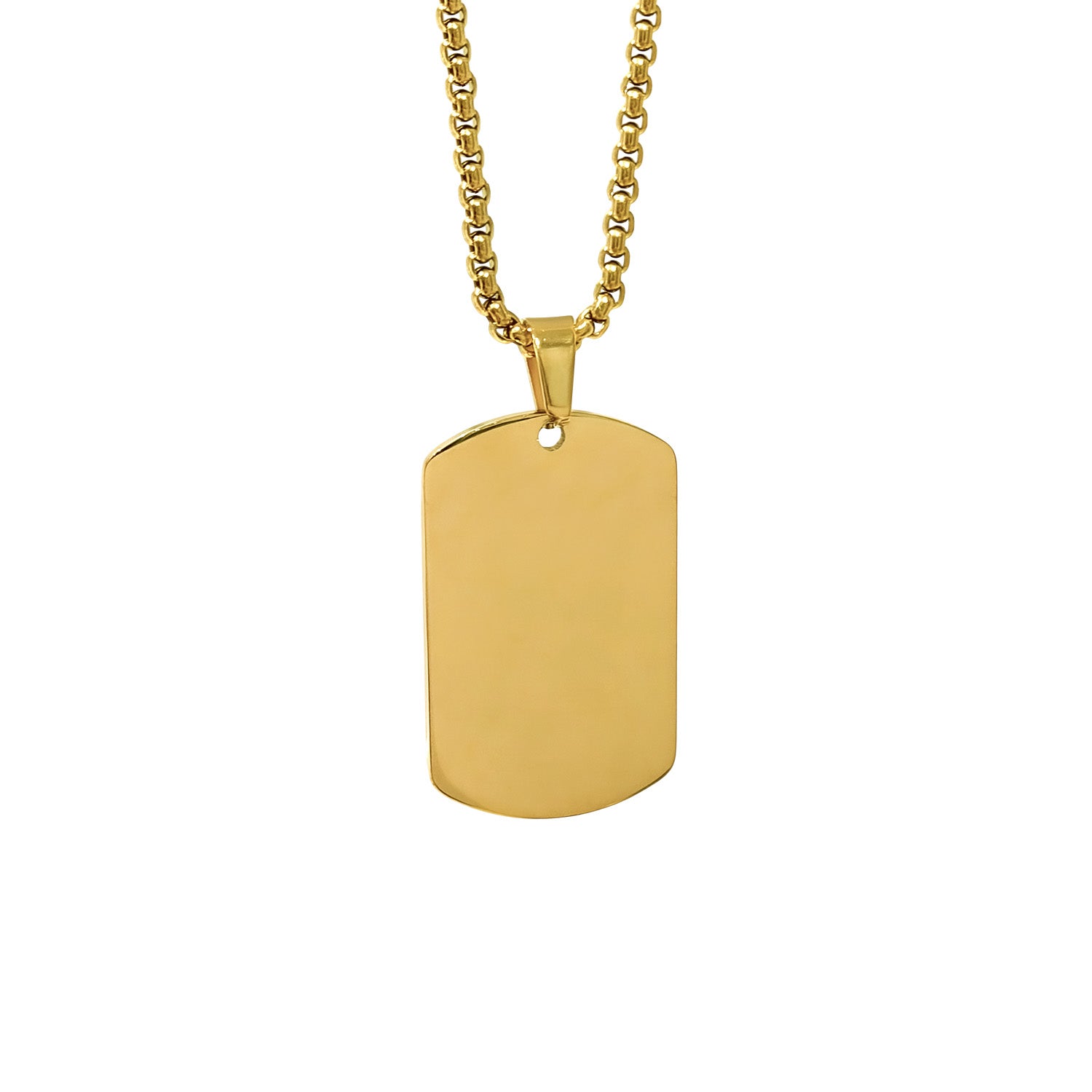 Hálsplatan er úr gullhúðuðu stáli og er um 36 mm á hæð. Festin er 50 cm löng. Hægt er að fá áletrun á plötuna.