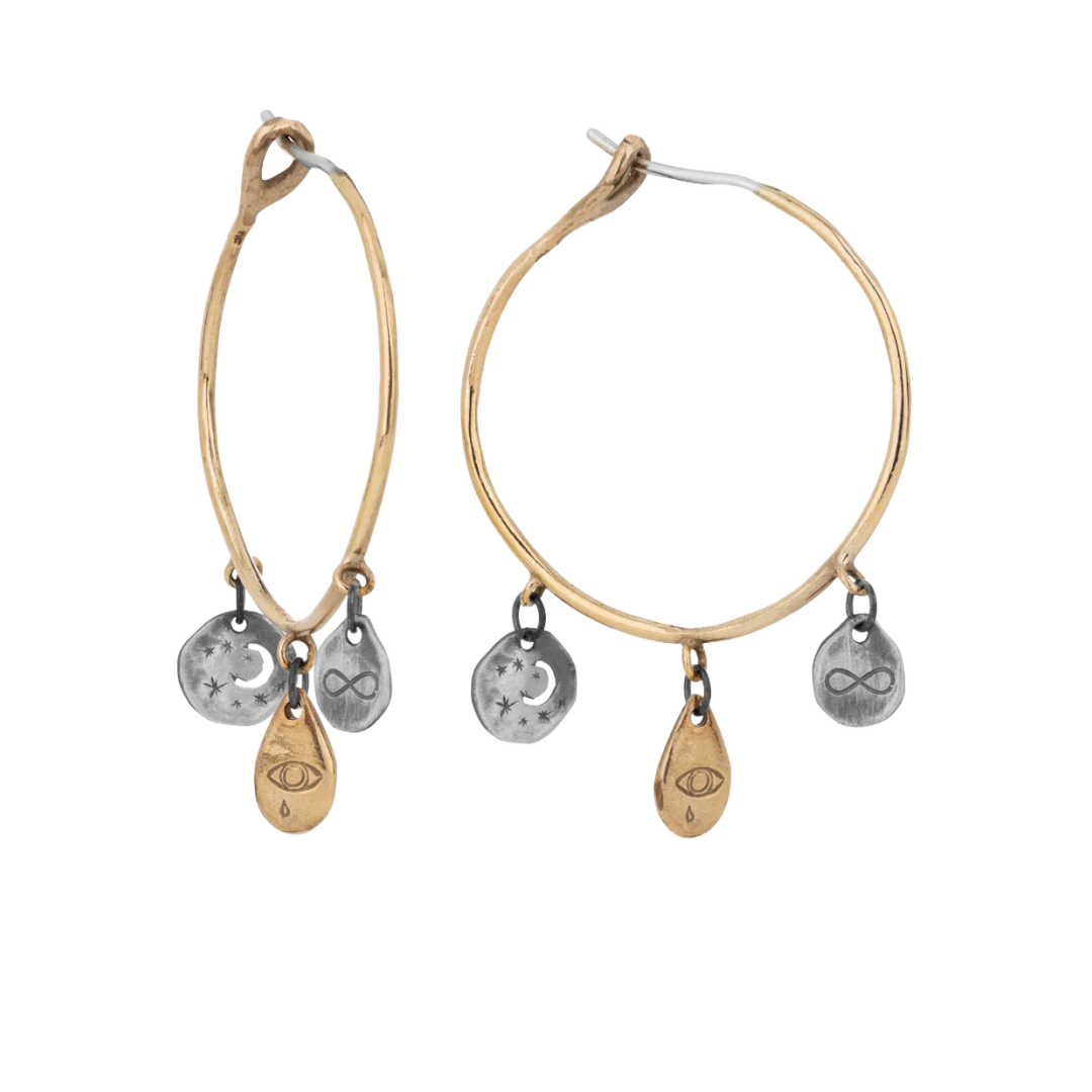 Bronze hoops with 3 dangling coins / tears with symbols.The symbols: The Moon in silver, The Weeping Eye in bronze, Eternity in silver.Length (front) = 3.5 cm / 1.4 inches Lenght with symbols ... Sjá nánar