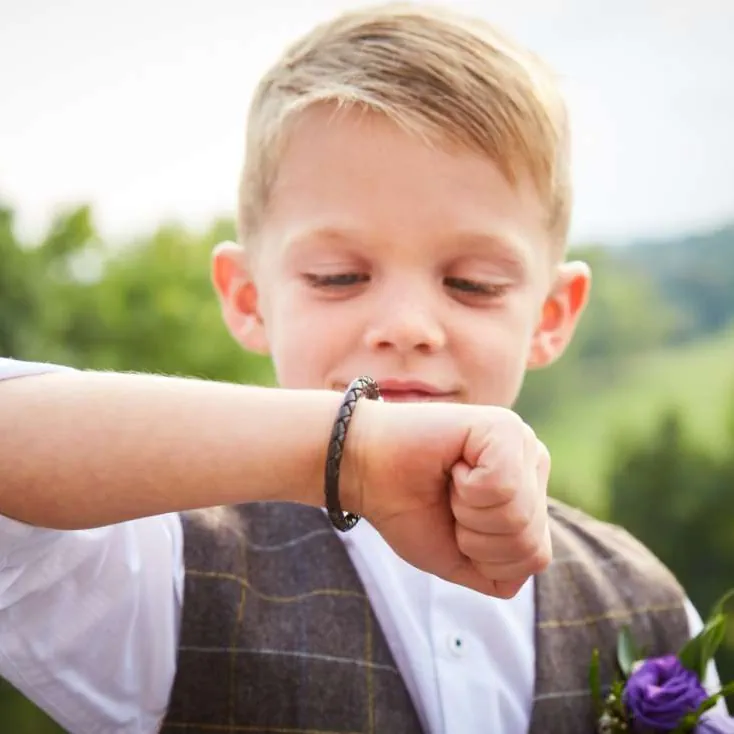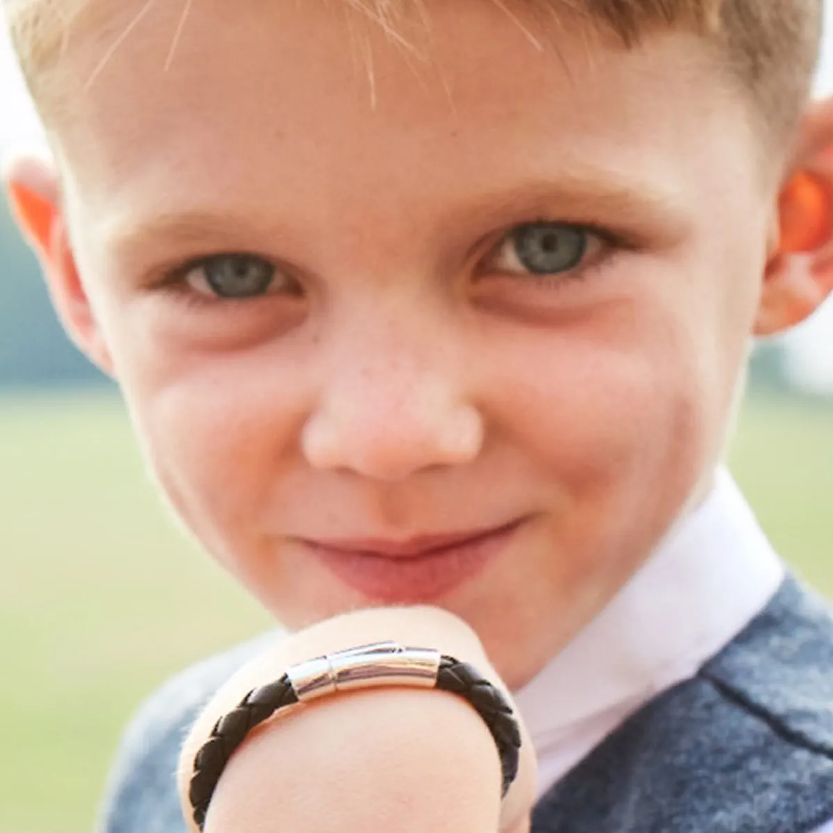 Efni armbands: Silfur & leður Aldursbil: 18 mánaða til 5 ára (þetta er einungis viðmið, við mælum með að mæla úlnlið barnsins) Lengd: 15cm