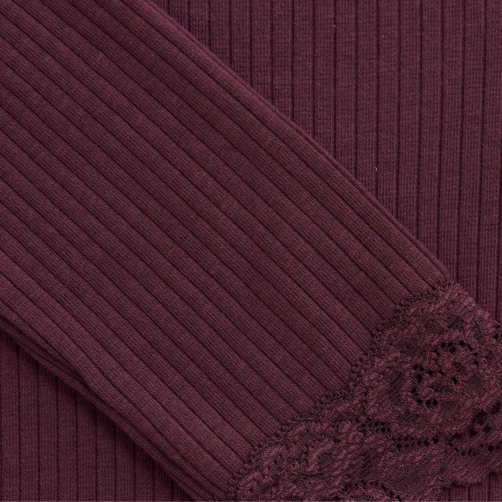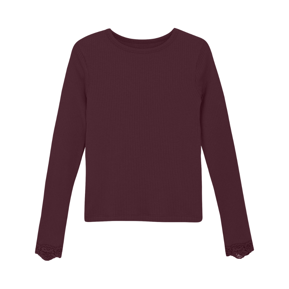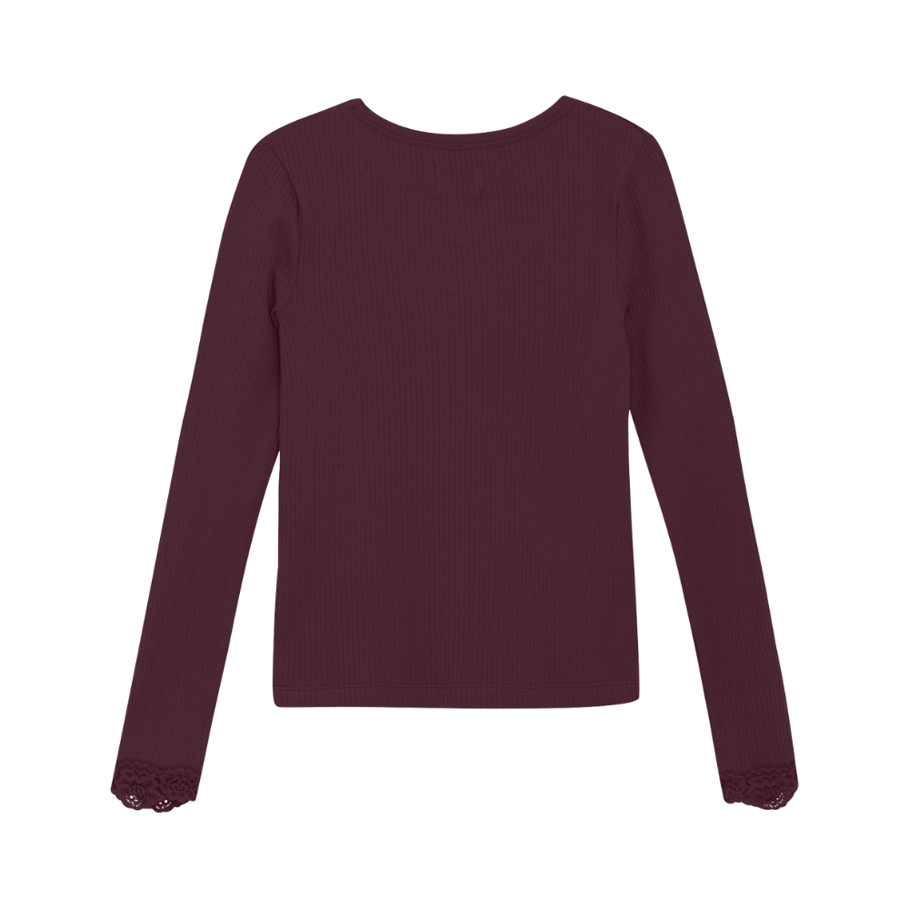 Vínrauður, langermabolur frá Creamie með pífu við ermar. 50% modal, 46% bómull og 4% Elastane.