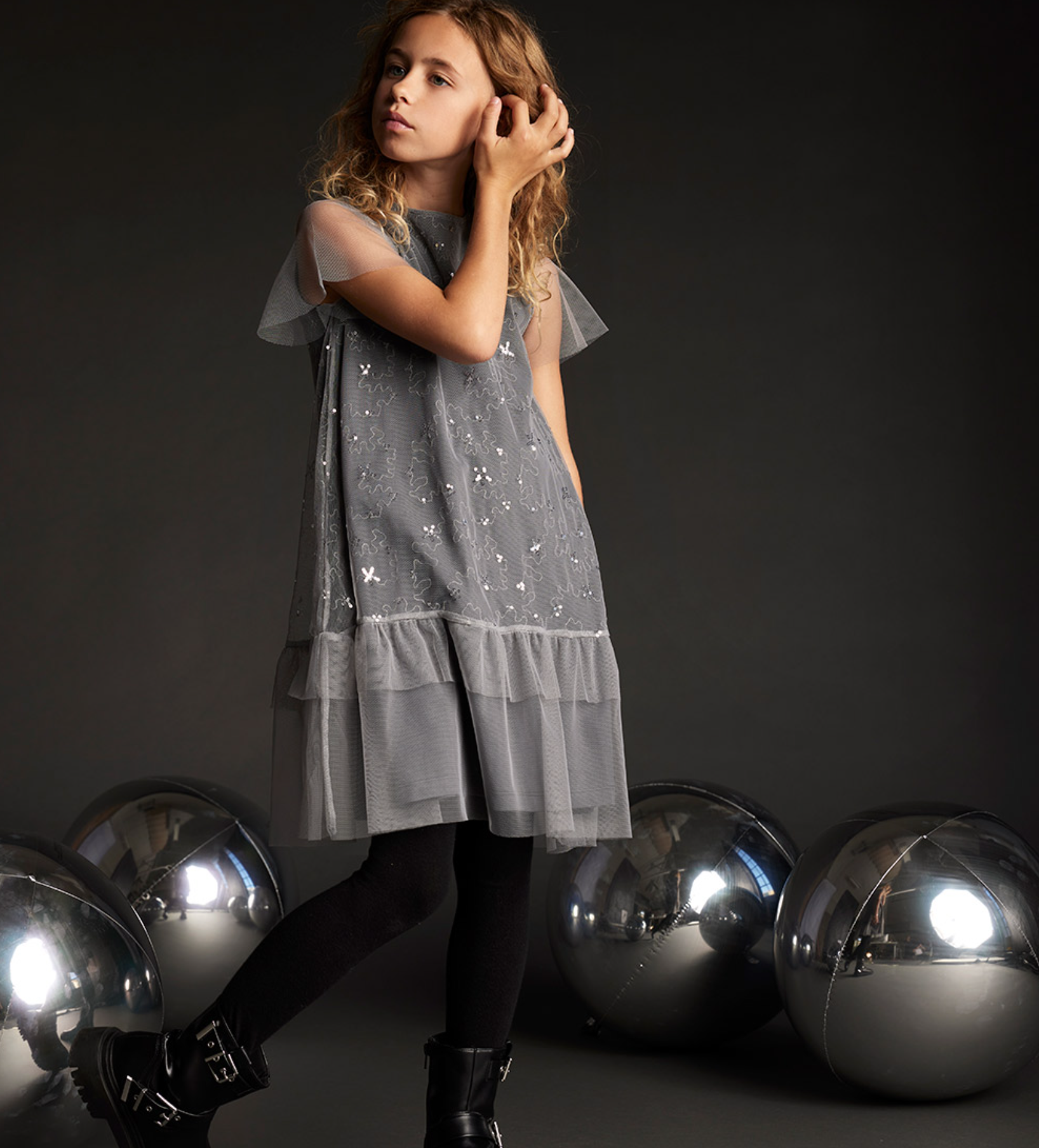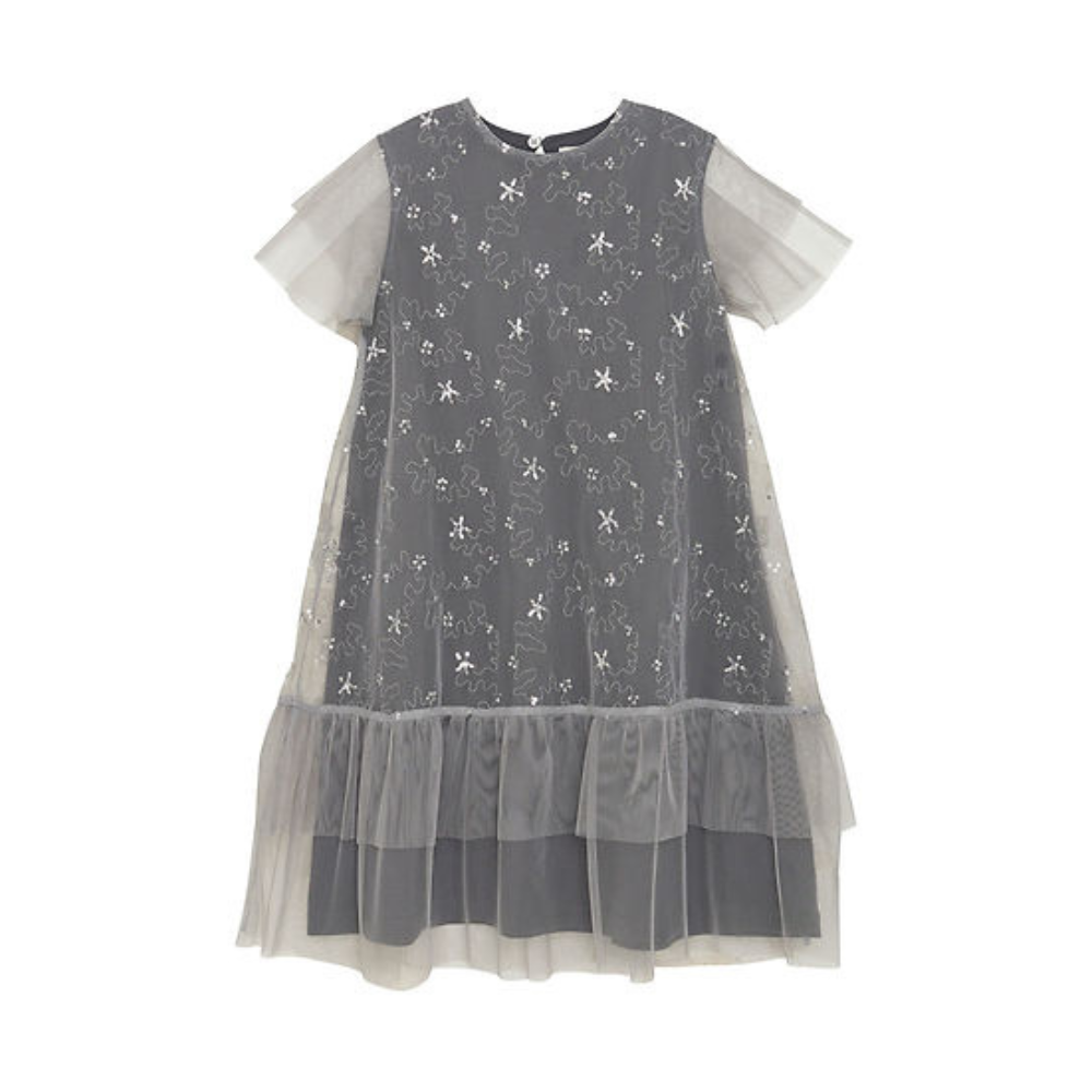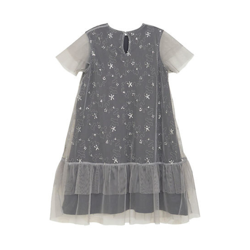 Fallegur kjóll með stuttum ermum og silfruðum palliettum. 100% polyester.