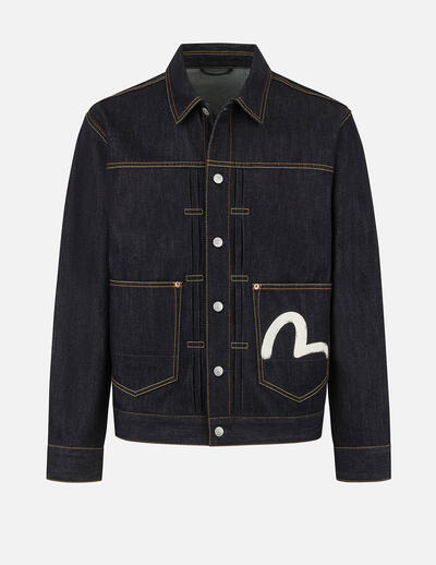 Flottur og fjölhæfur gallajakki frá Evisu í afslöppuðu sniði, með mávalogoinu sem einkennir merkið framan á öðrum vasanum.