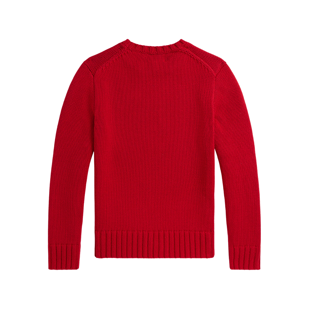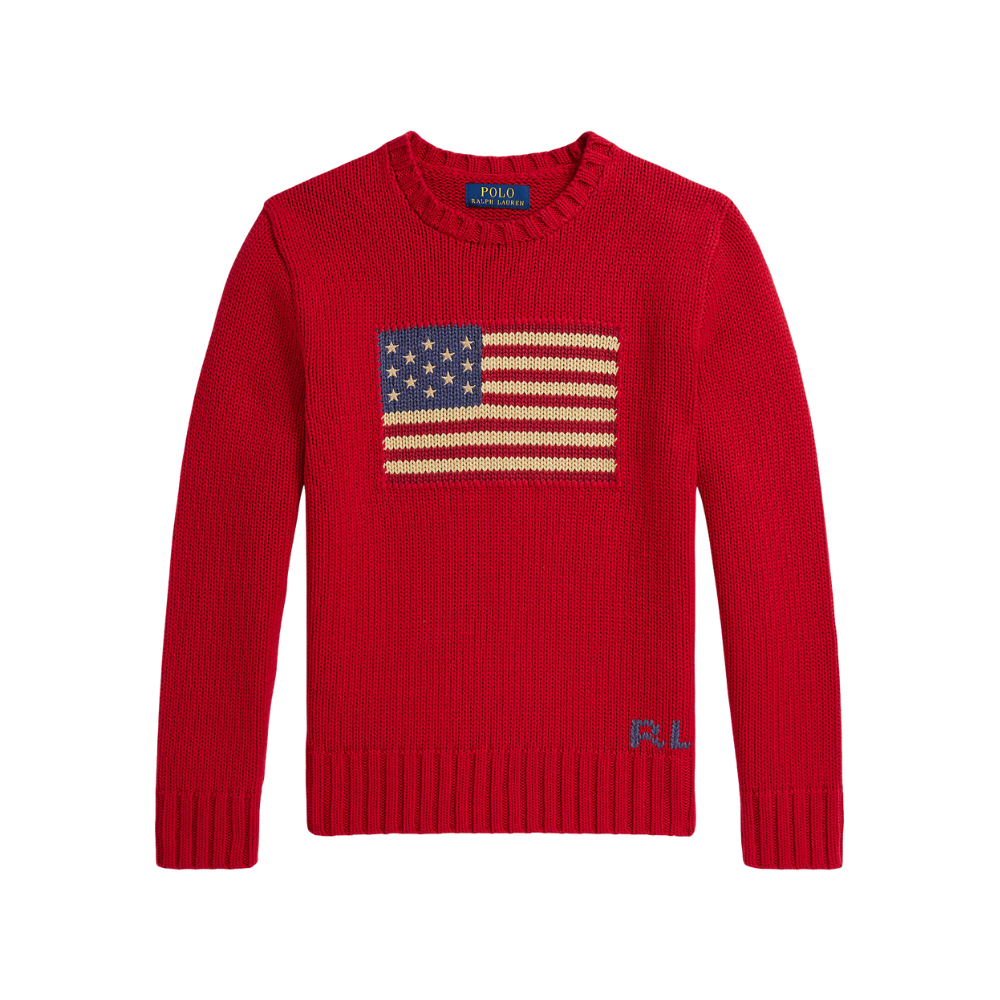 Rauð prjónapeysa frá Polo Ralph Lauren með stórum fána að framan. 100% bómull.