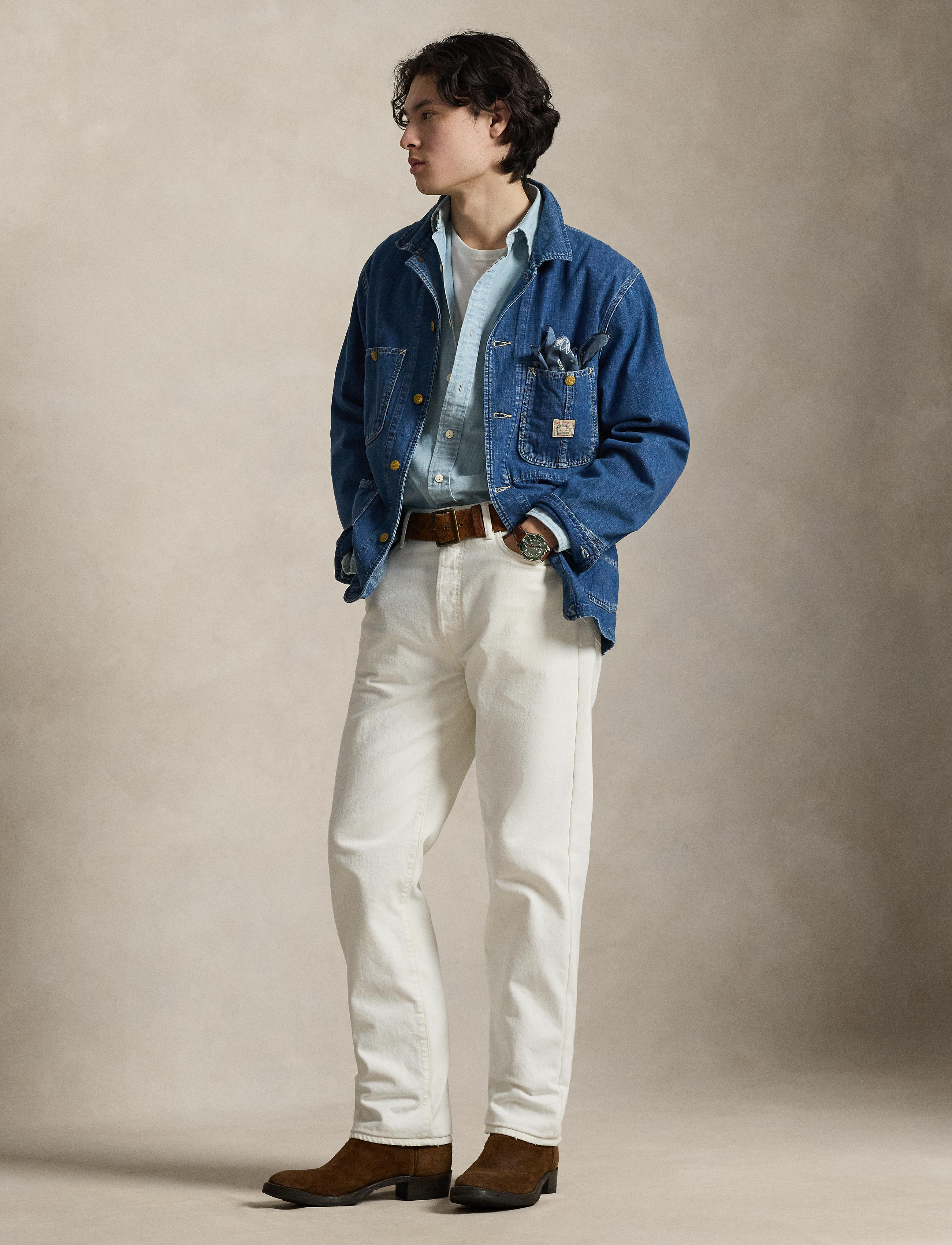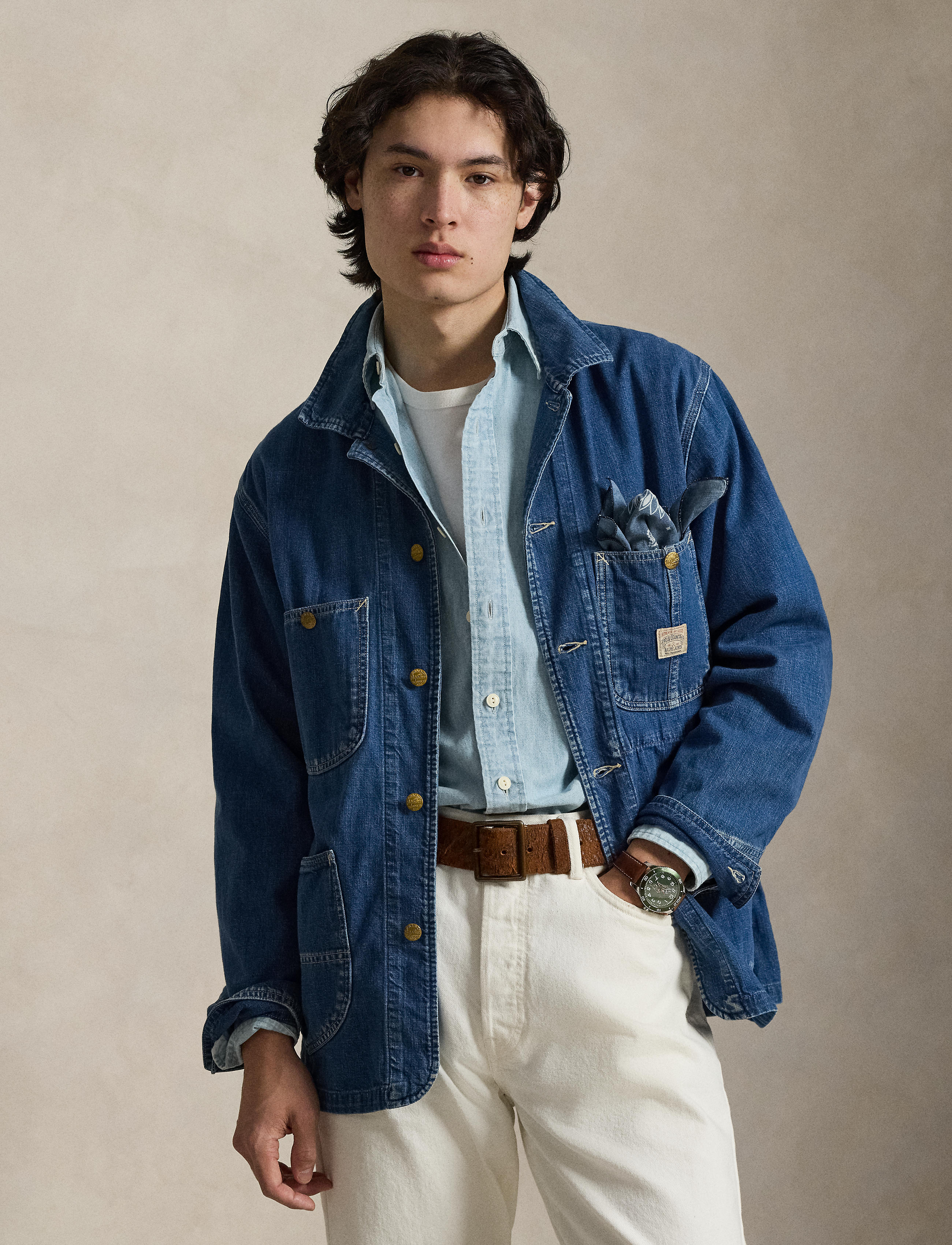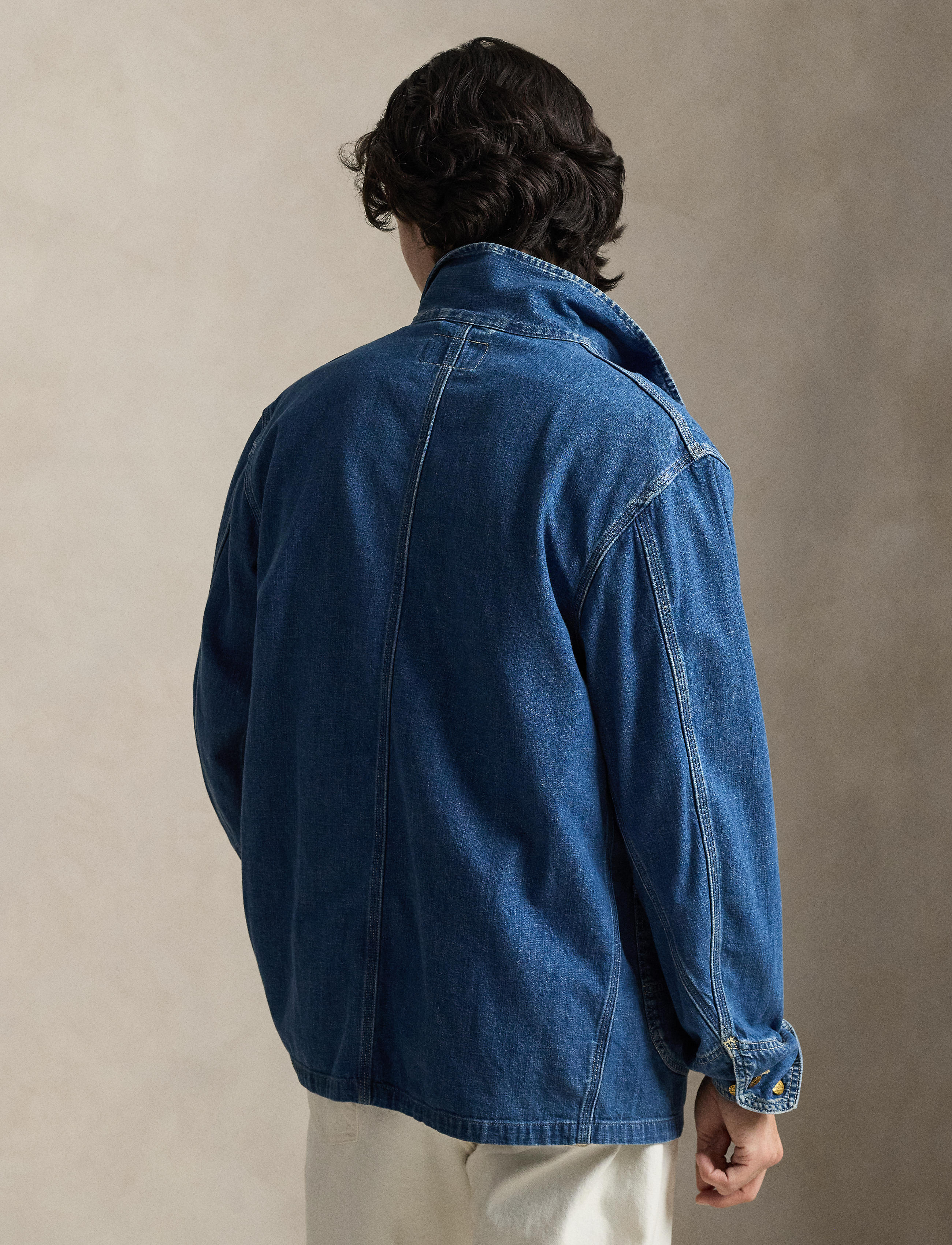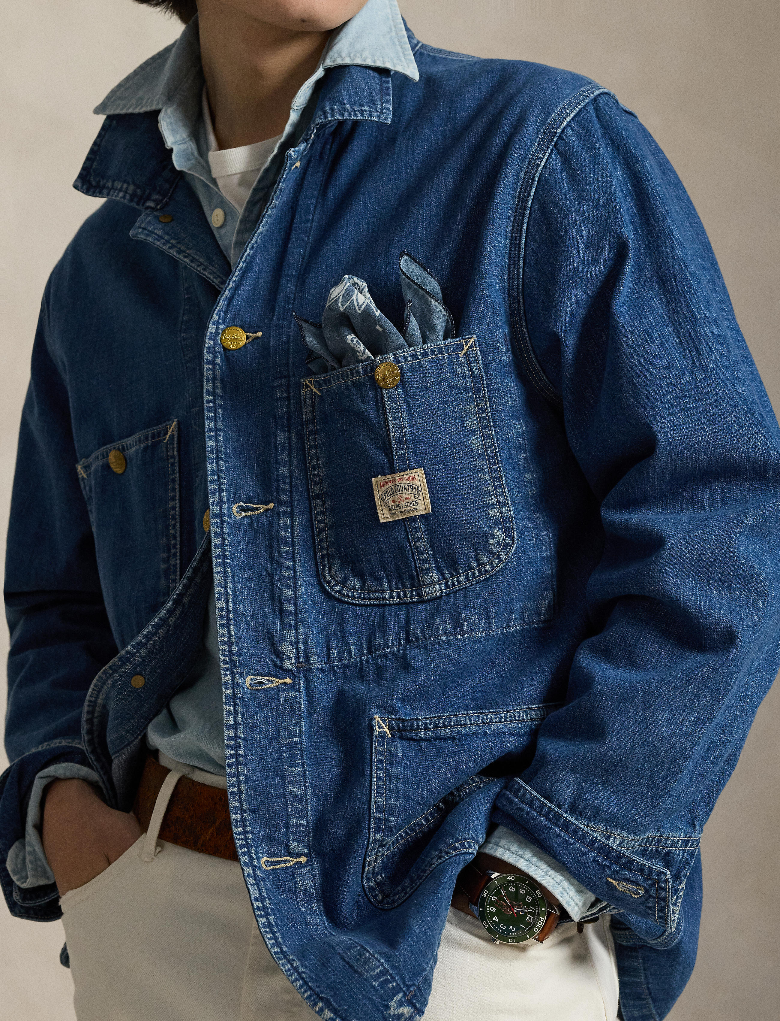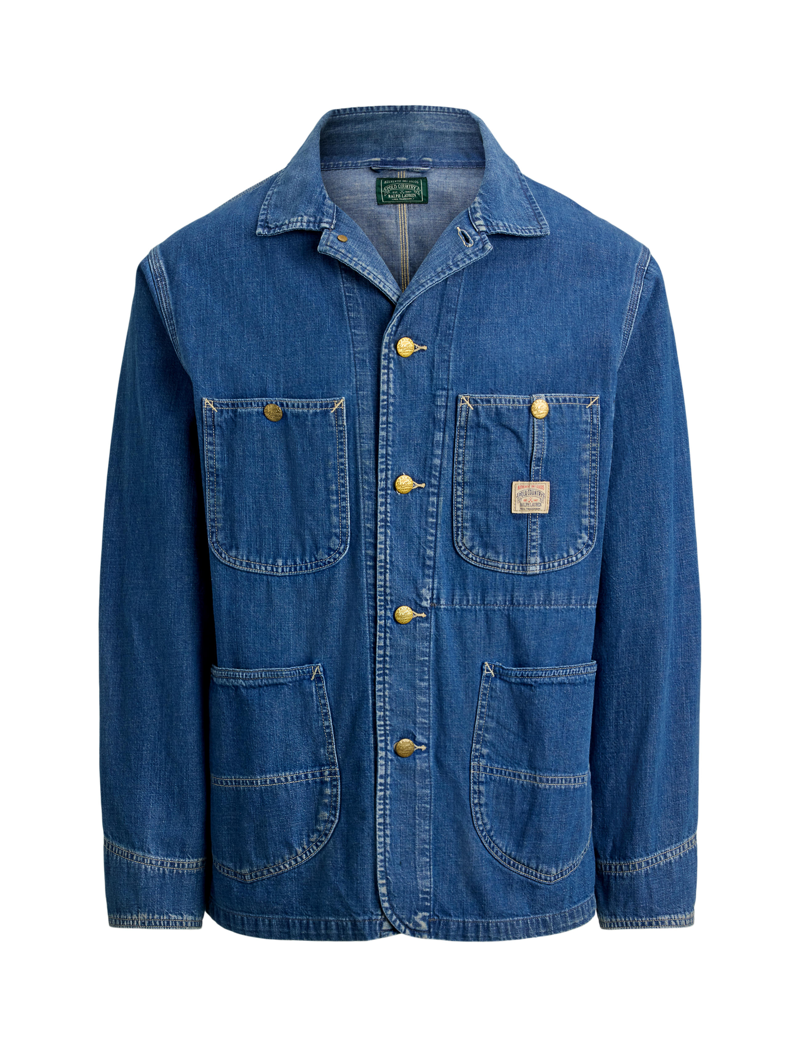 This utilitarian-inspired jacket is crafted with lightweight cotton denim that is dyed with indigo. It is lightly sanded for subtle distressing and finished with an archival-style “Polo ... Sjá nánar
