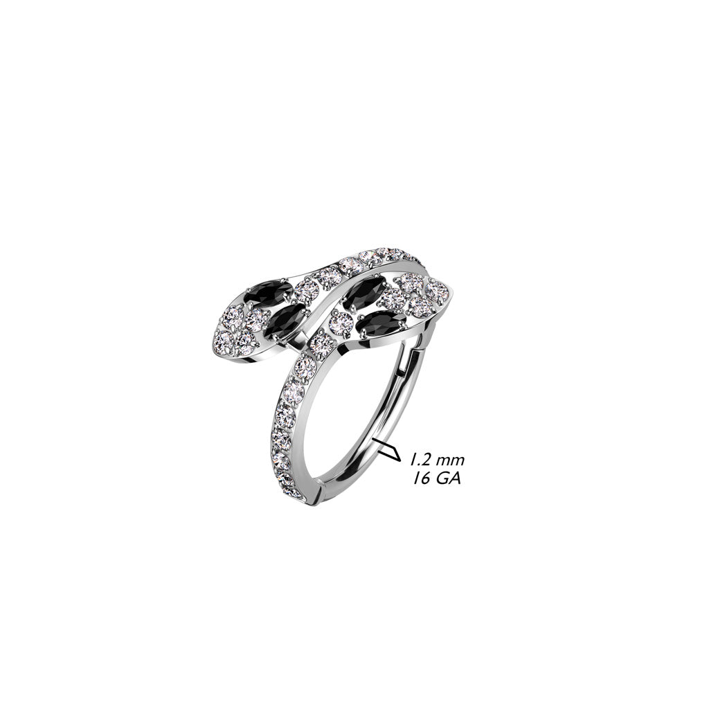Smelluhringur með snákum og steinum. Gerður úr titanium og PVD húðaður.  Passar í t.d. Helix, Forward Helix, Rook, Daith, Eyrnasnepla, Conch og fl. göt. Lokkurinn er 8mm og 10mm breiður og ... Sjá nánar