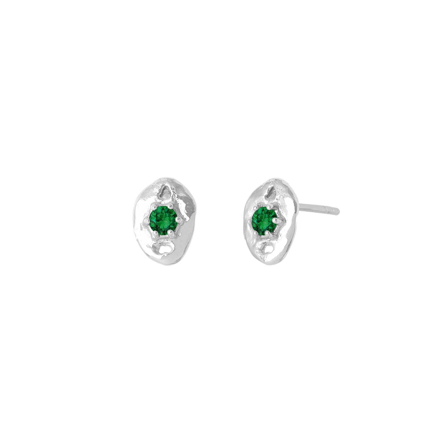 Eyrnalokkarnir eru handsmíðaðir úr rhodiumhúðuðu silfri með emerald steinum. Hæð lokkana er um 9 mm. Hönnuður og smiður er Berglind Snorra.